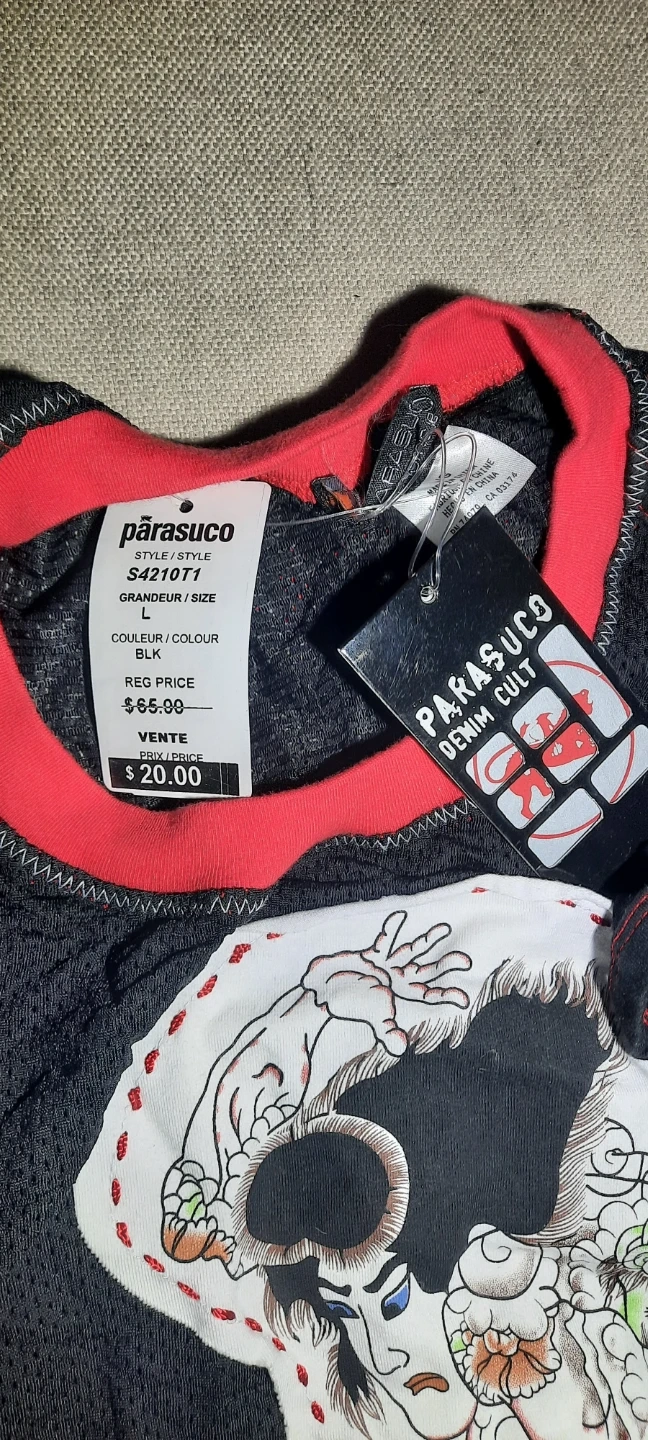 This Parasuco sleeveless shirt features a graphic print on the front. It's a size large with a black base colour and red trim. Shirt material is a blend.