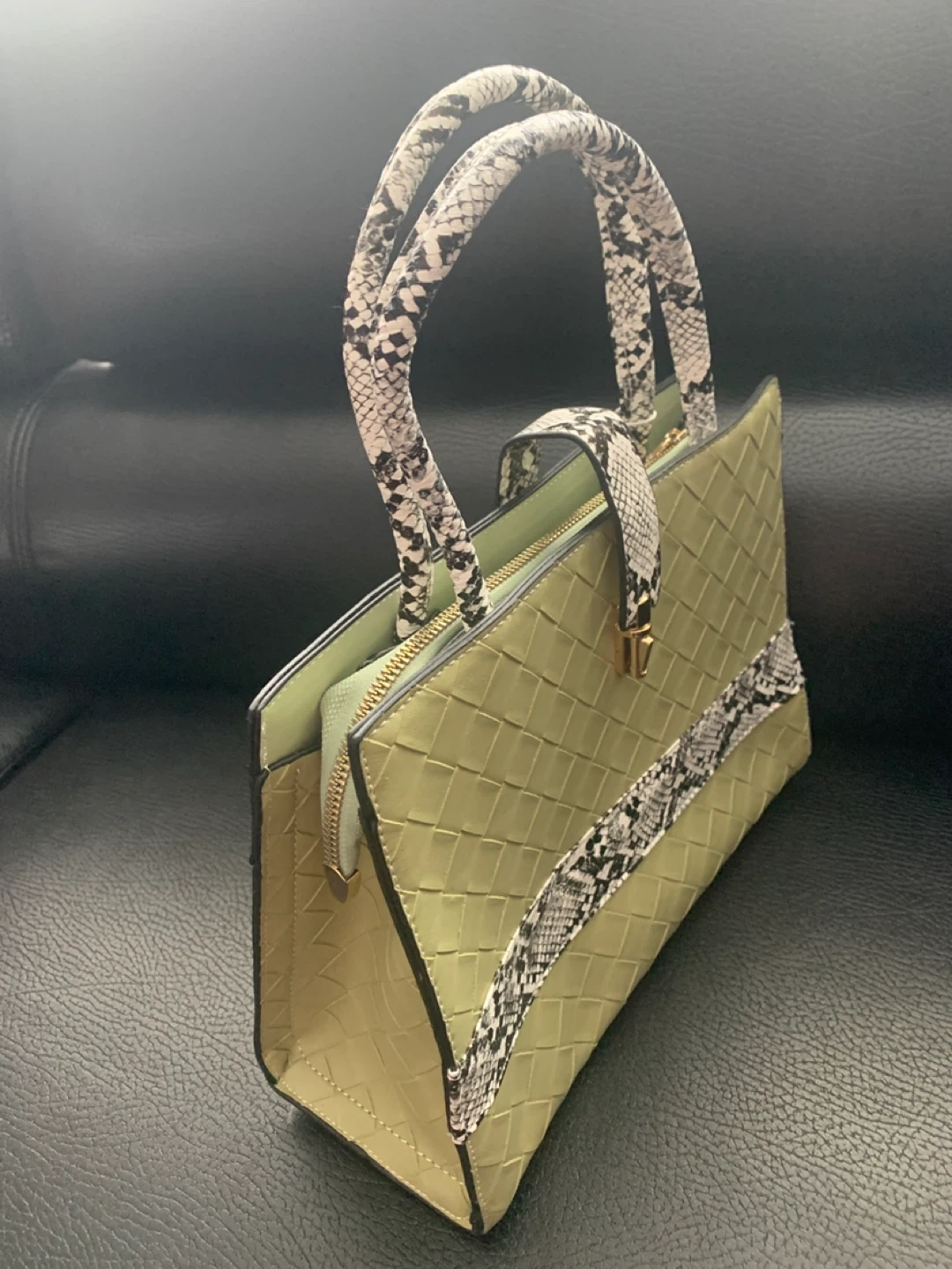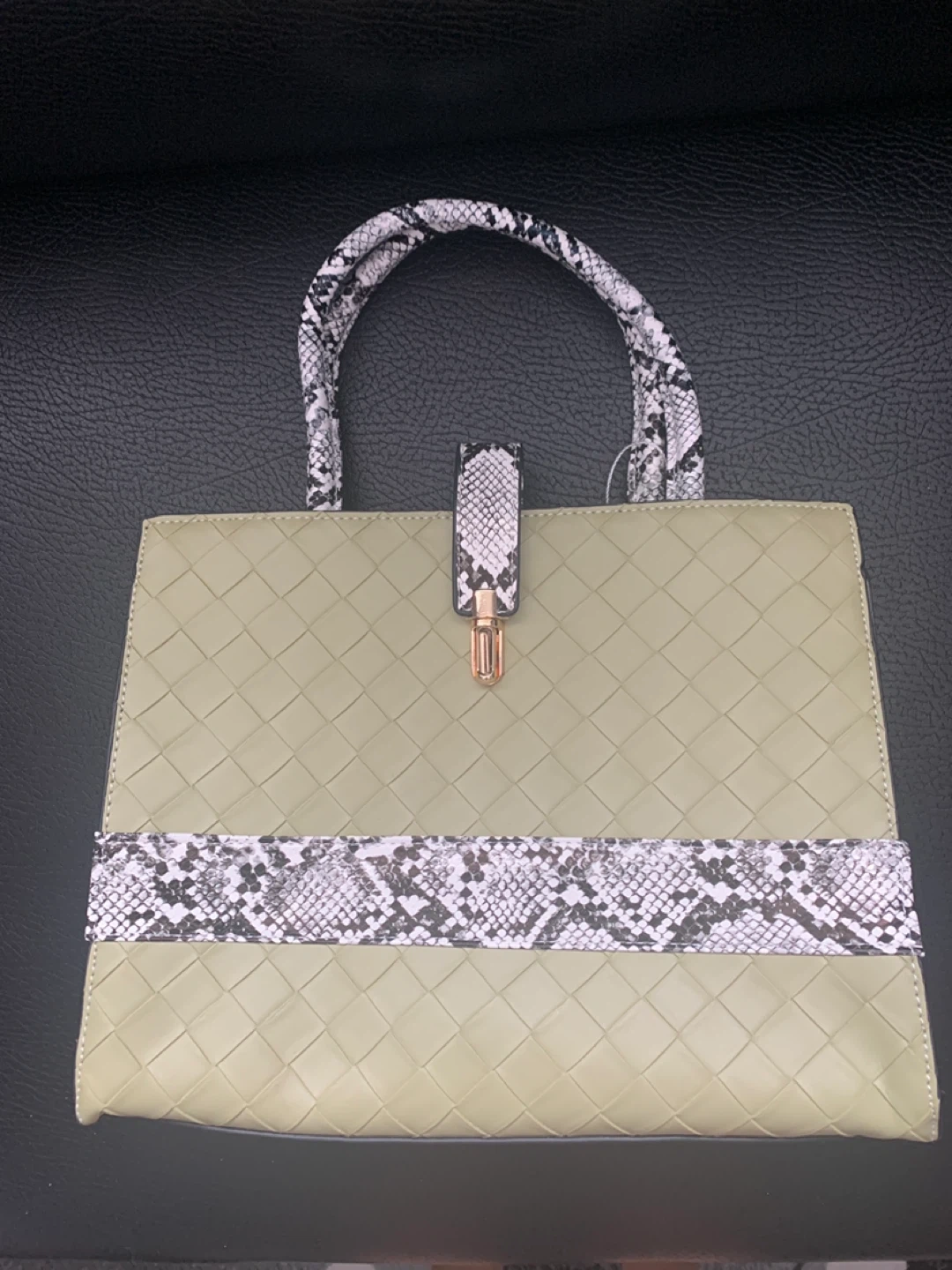 This stylish handbag features a woven olive green exterior with contrasting snake print accents on the handles and strap. It has a secure clasp closure and a zippered main compartment. The textured design makes it a versatile accessory.