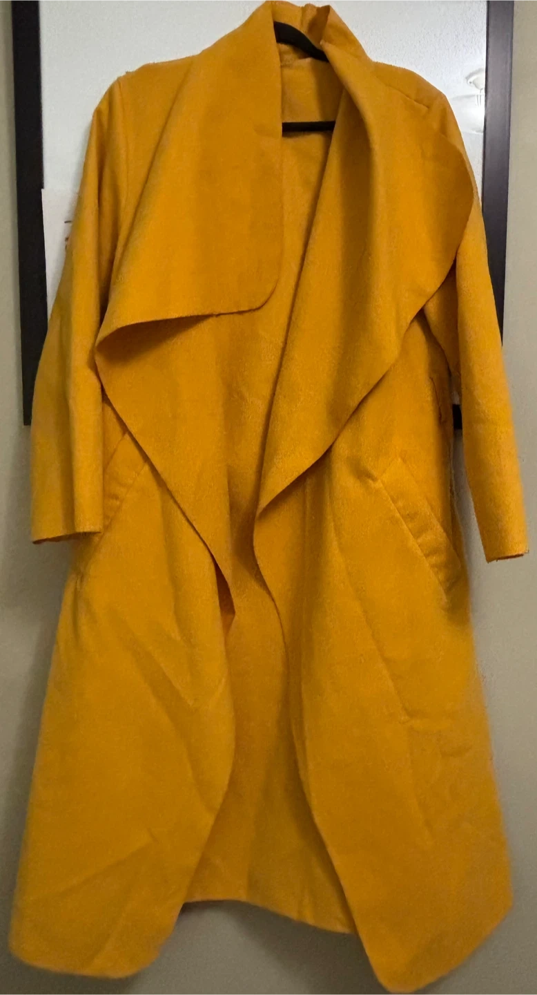 This stylish yellow coat features a unique waterfall collar. It's made from a soft, cozy material, perfect for cooler weather. Includes two front pockets.