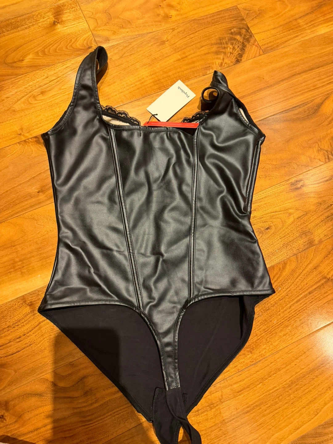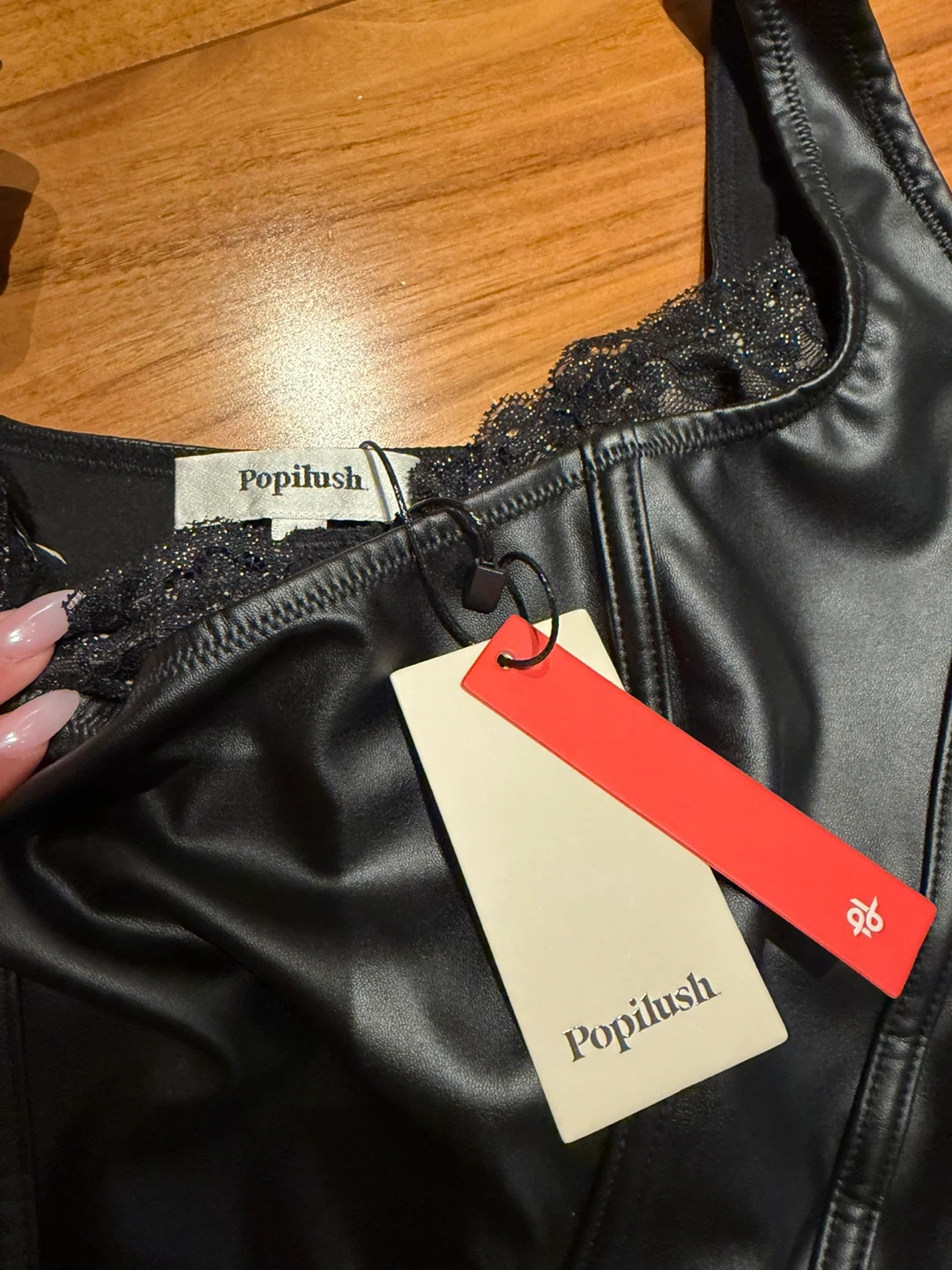 Brand New Never Worn Popilush bodysuit in a faux leather finish. Features delicate lace trim along the neckline and adjustable straps. It's designed with a flattering corset-style front. This piece adds a stylish touch to any outfit!