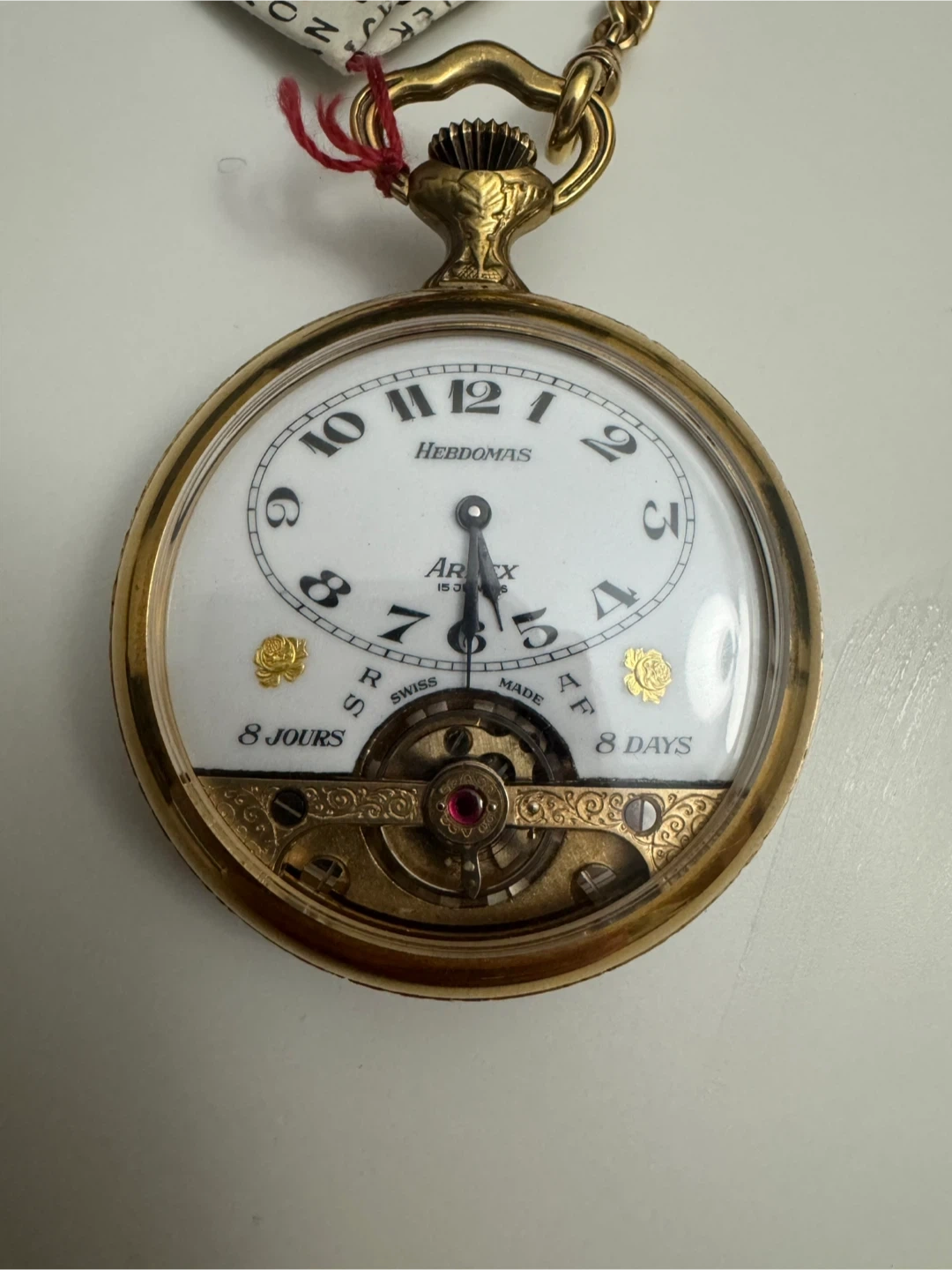As we were cleaning his house, we found a couple of his antiques; we discovered this Hebdomas 8 day pocket watch.