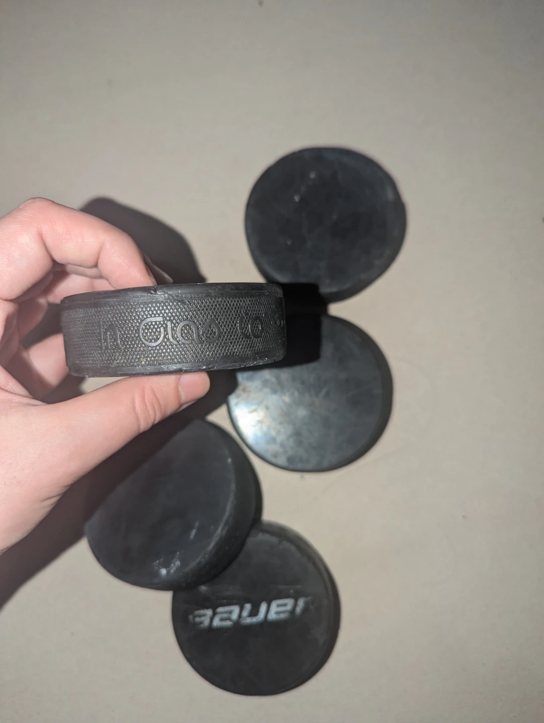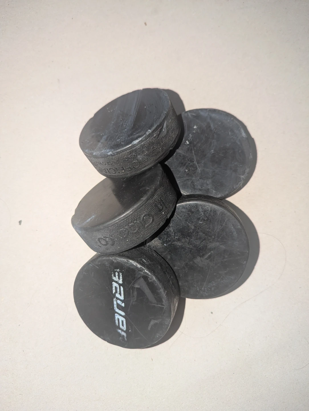 A set of five standard hockey pucks. These are solid rubber pucks, perfect for practice or a game of street hockey. They're durable and ready for action!