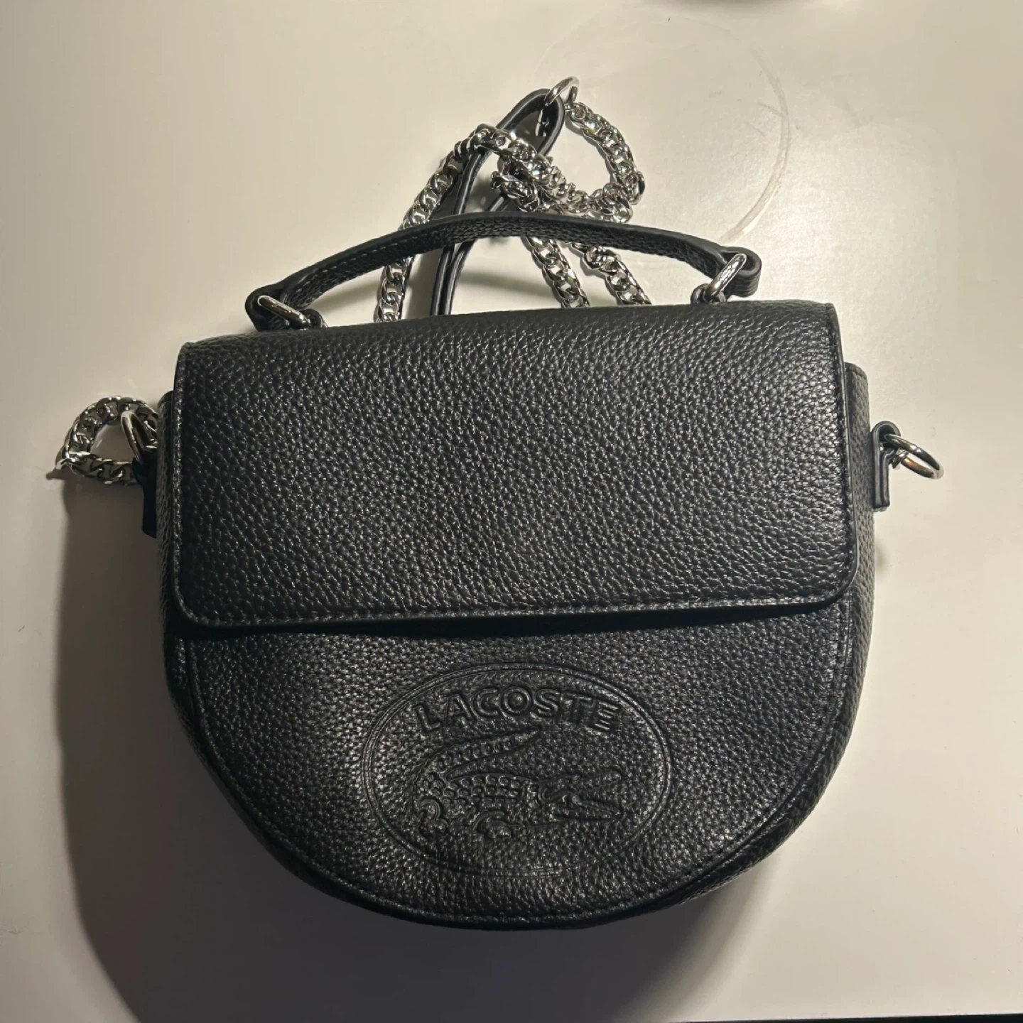 A stylish black leather shoulder bag by Lacoste. It features a textured finish and a silver-tone chain strap for a chic look. This bag's compact size makes it perfect for carrying essentials on the go. it is a cross body bag