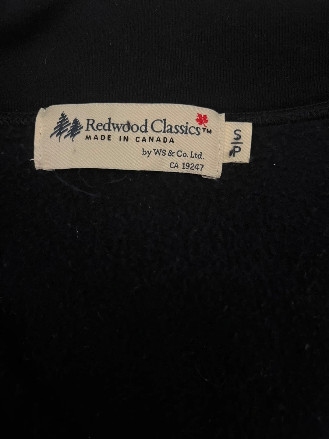 Navy quarter-zip sweatshirt by Redwood Classics, featuring "RBC Borealis" embroidered on the chest. Made in Canada. Size small.
