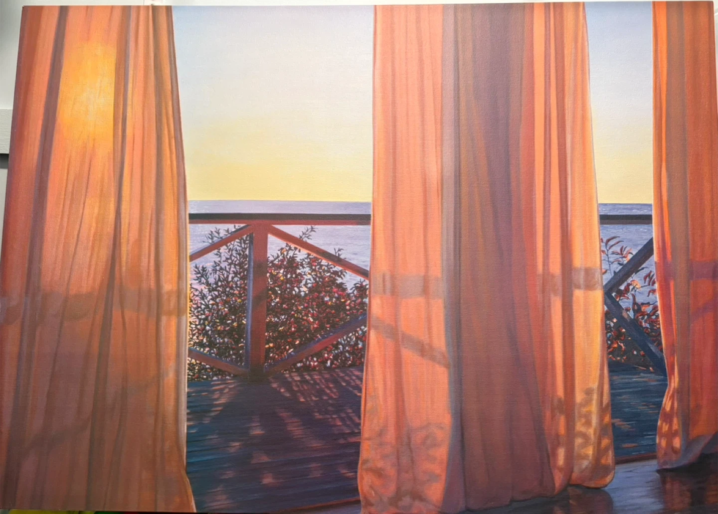This is a print depicting a serene sunrise scene. It showcases coral-coloured curtains framing a view of the ocean from a wooden balcony. The artwork captures the soft light and tranquil atmosphere of early morning.