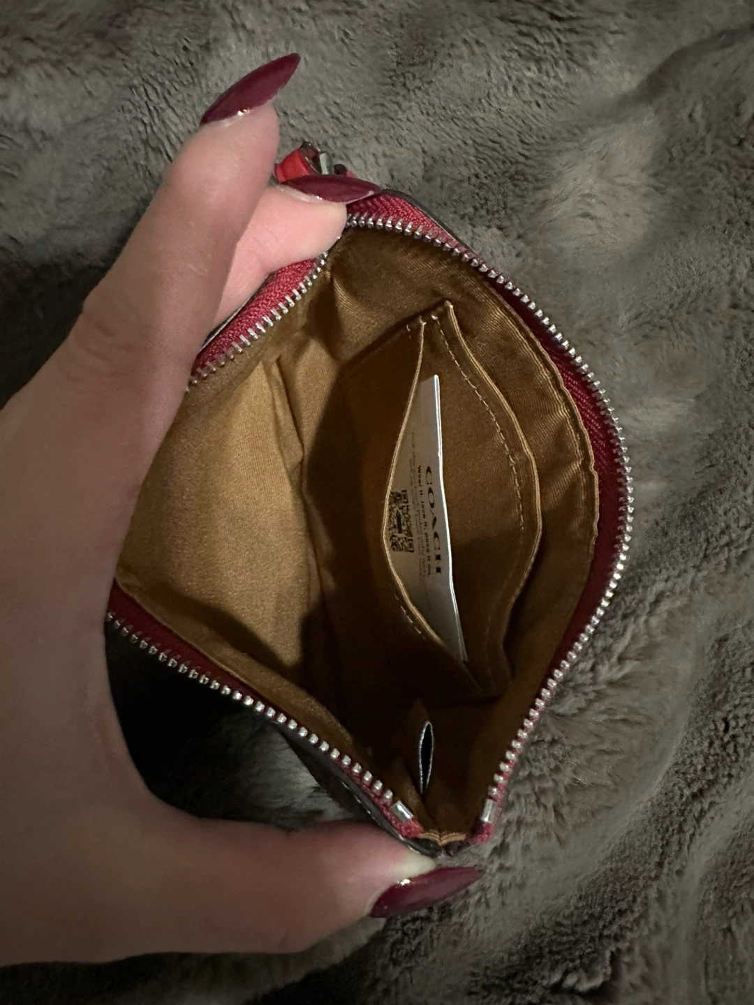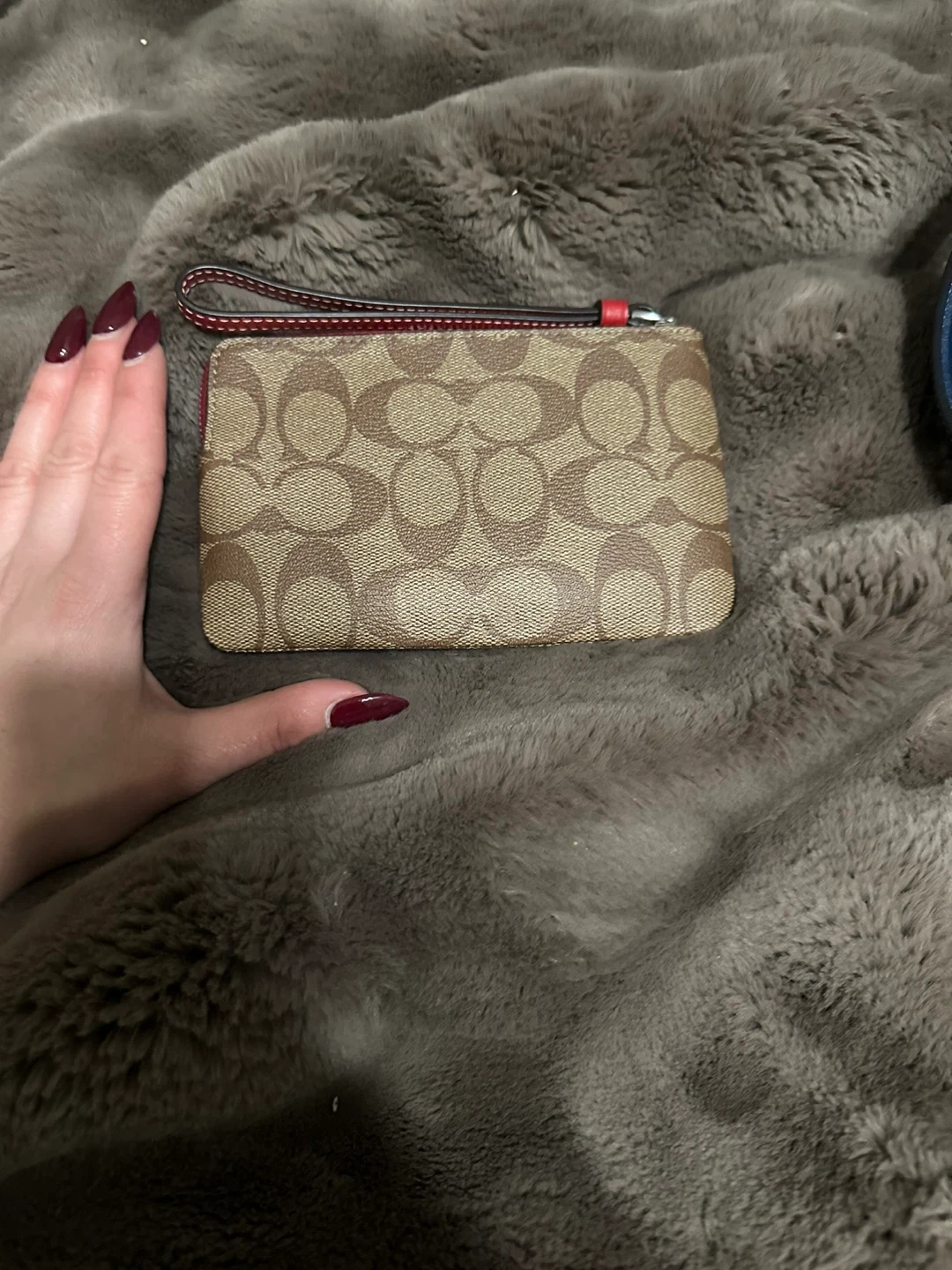 This is a Coach wristlet with the signature C pattern and a cute strawberry design. It's perfect for carrying essentials like cards and keys. Zipper closure with a red interior and a small card slot inside.