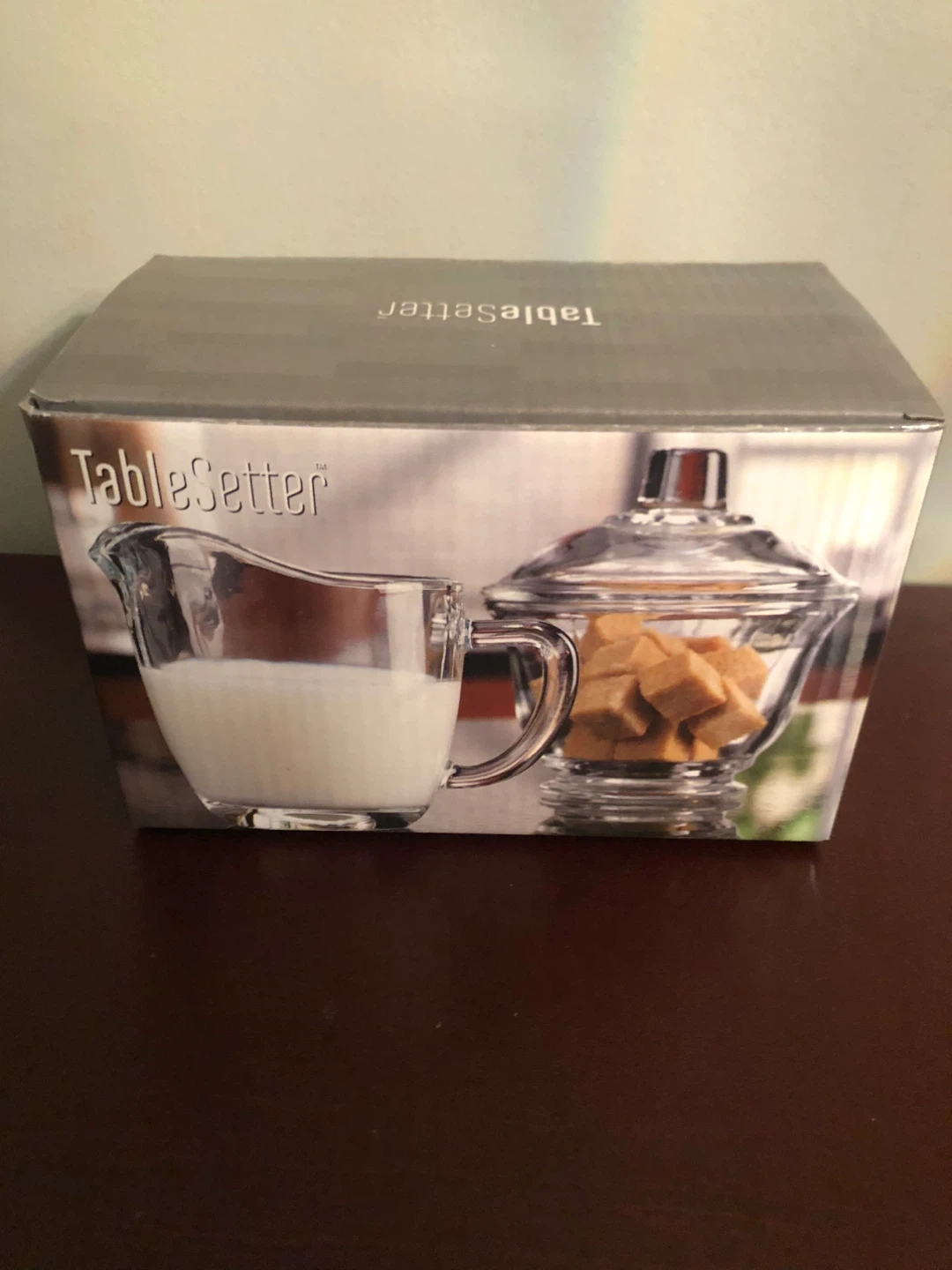 This is a TableSetter glass creamer and sugar bowl set. It includes a 6 oz creamer and a 6 oz sugar bowl with a lid. Both pieces are made of clear glass and are dishwasher safe.