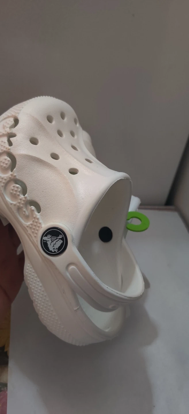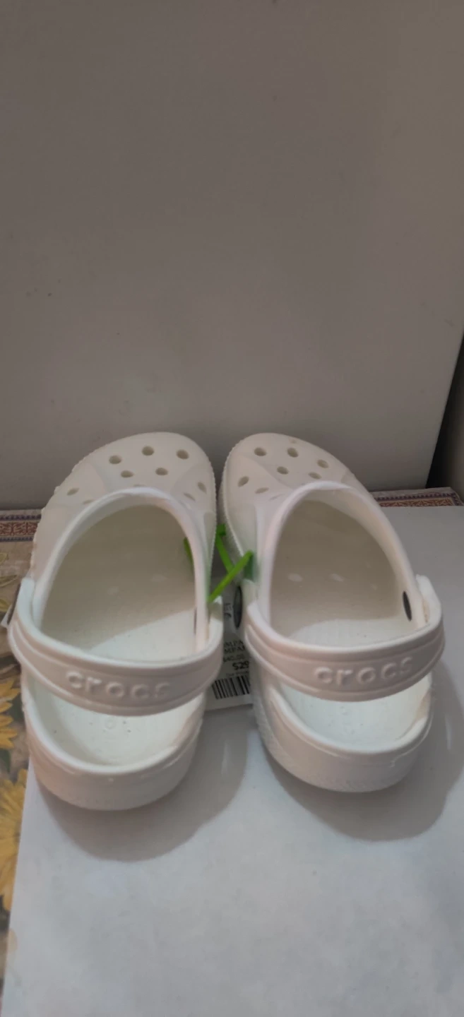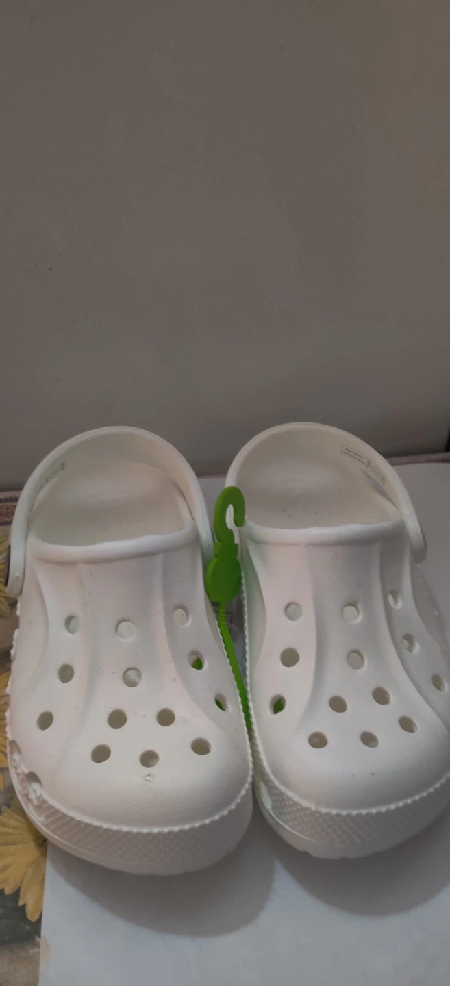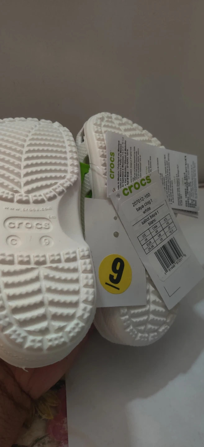 These are white Crocs in kids size 9. They're made of Croslite material and have the classic Crocs design. Great for casual wear!