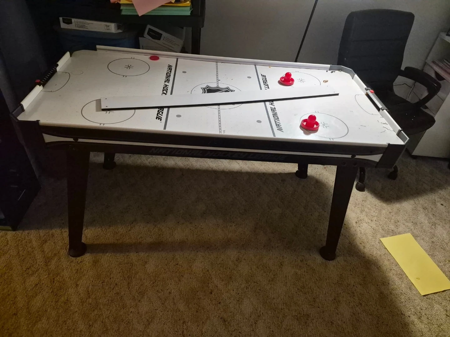 It's an air hockey table with a National Hockey League design. Includes two red strikers and puck i do have the side pieces and the front pieces just need to be screwed