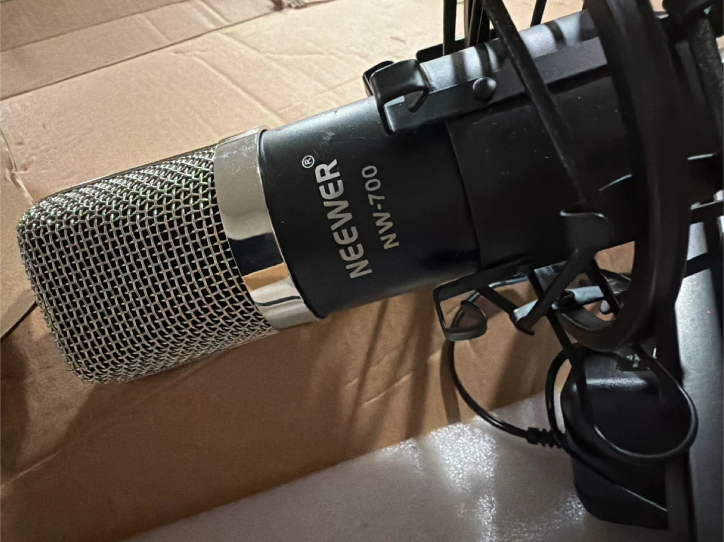 This is a Neewer NW-700 condenser microphone kit. It comes with a boom arm and a pop filter for convenient use. The microphone is black and designed for clear audio recording.