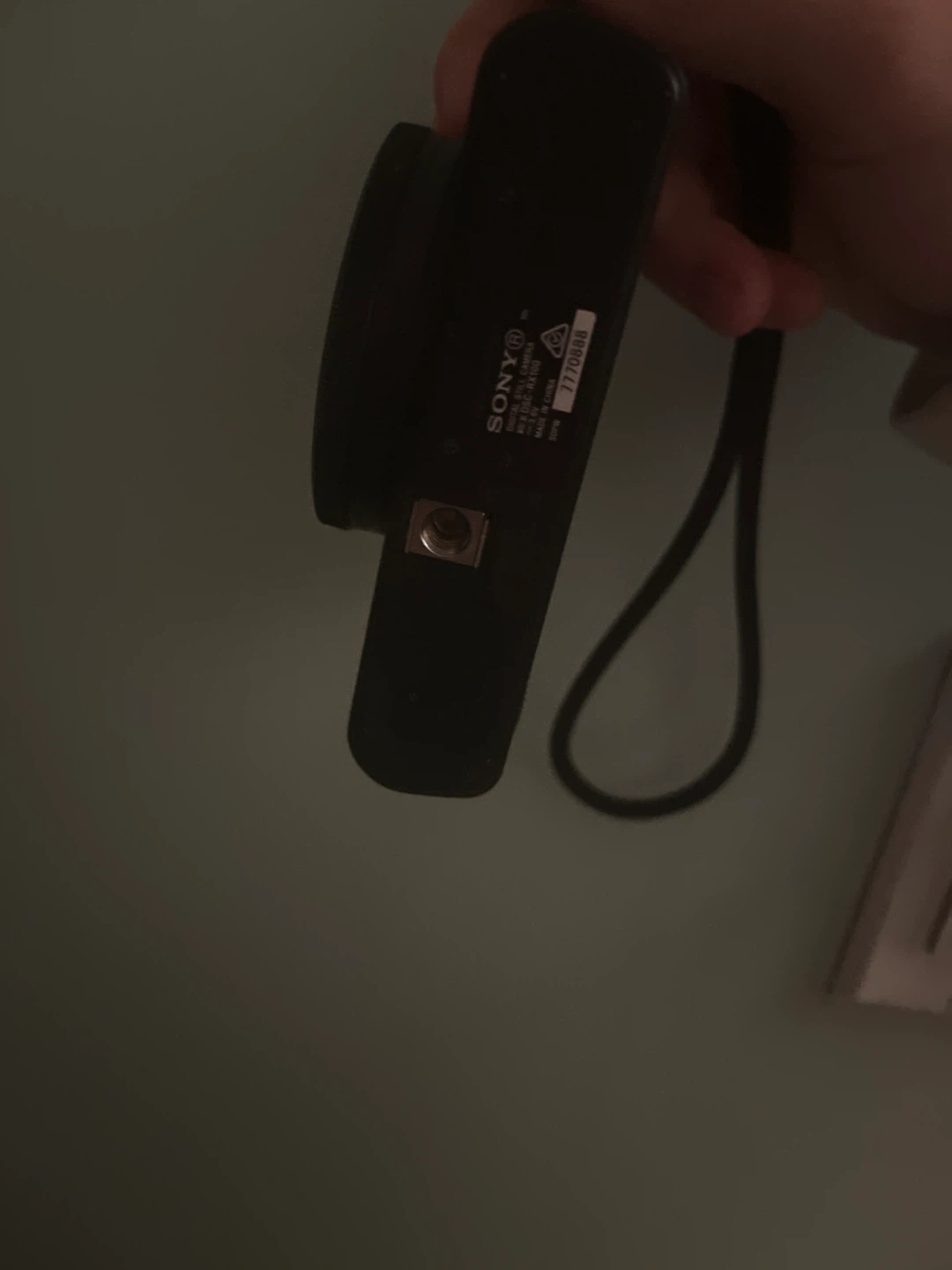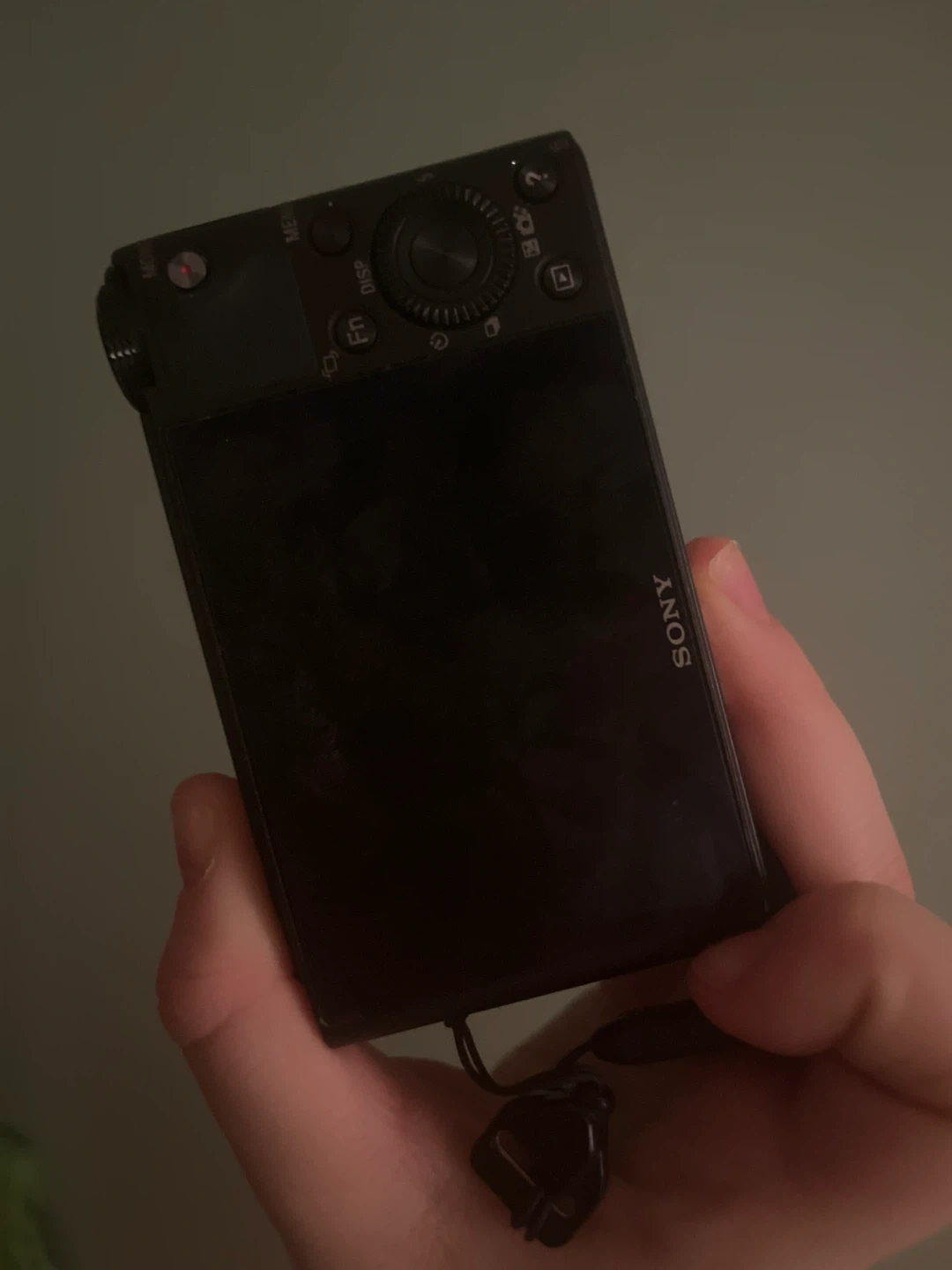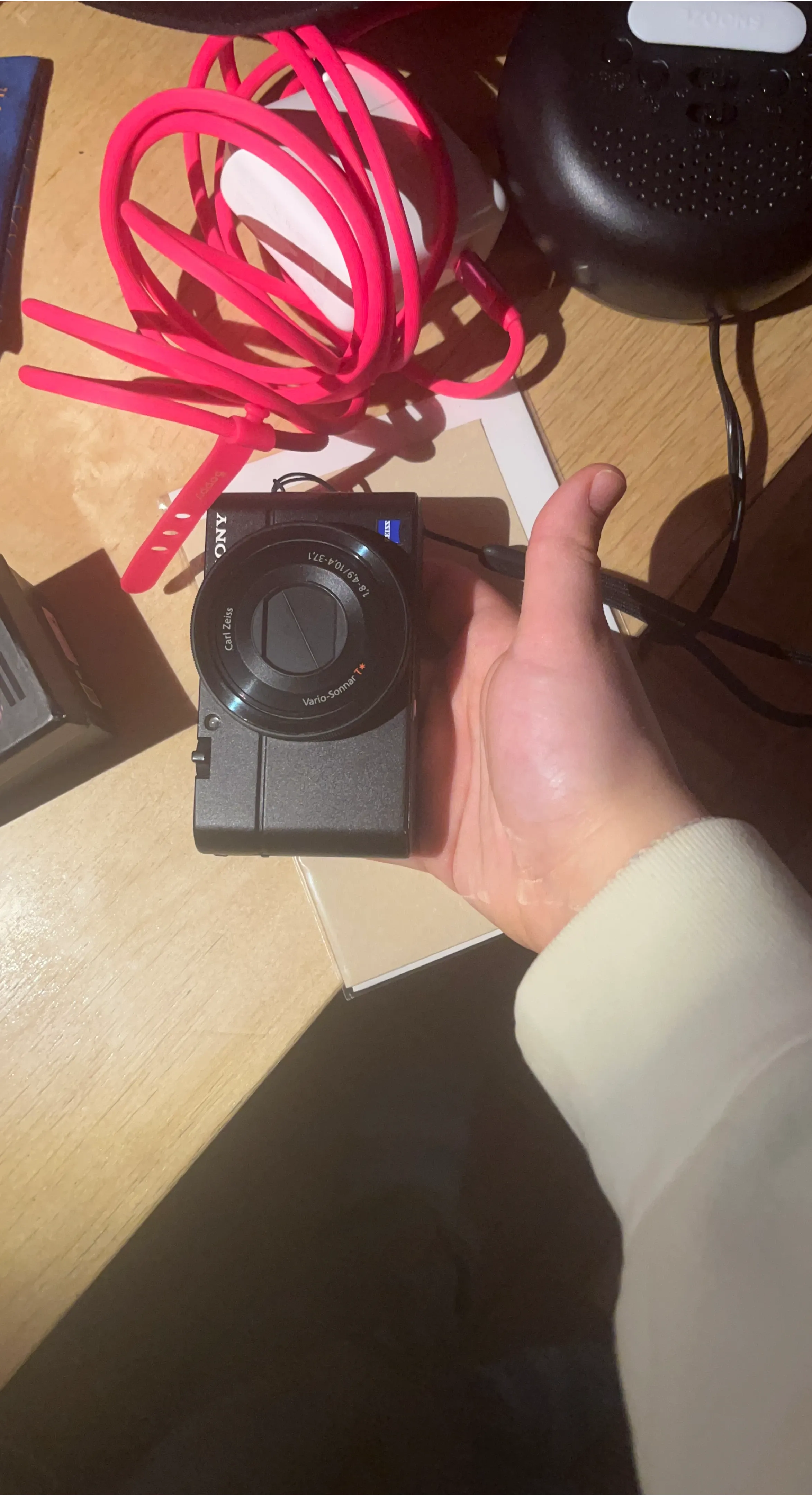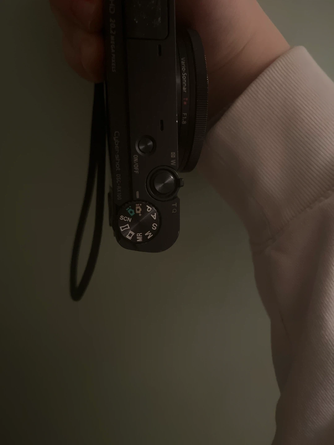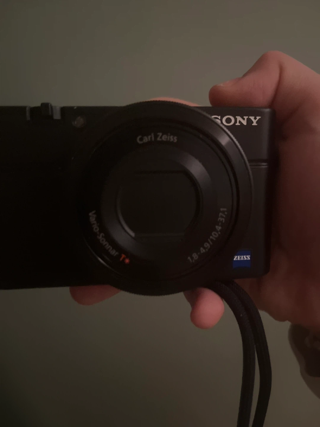 This is a Sony Cyber-shot DSC-RX100 digital camera. It features a Carl Zeiss Vario-Sonnar T* lens with a 1:1.8-4.9/10.4-37.1 aperture. The camera is black and includes a wrist strap.