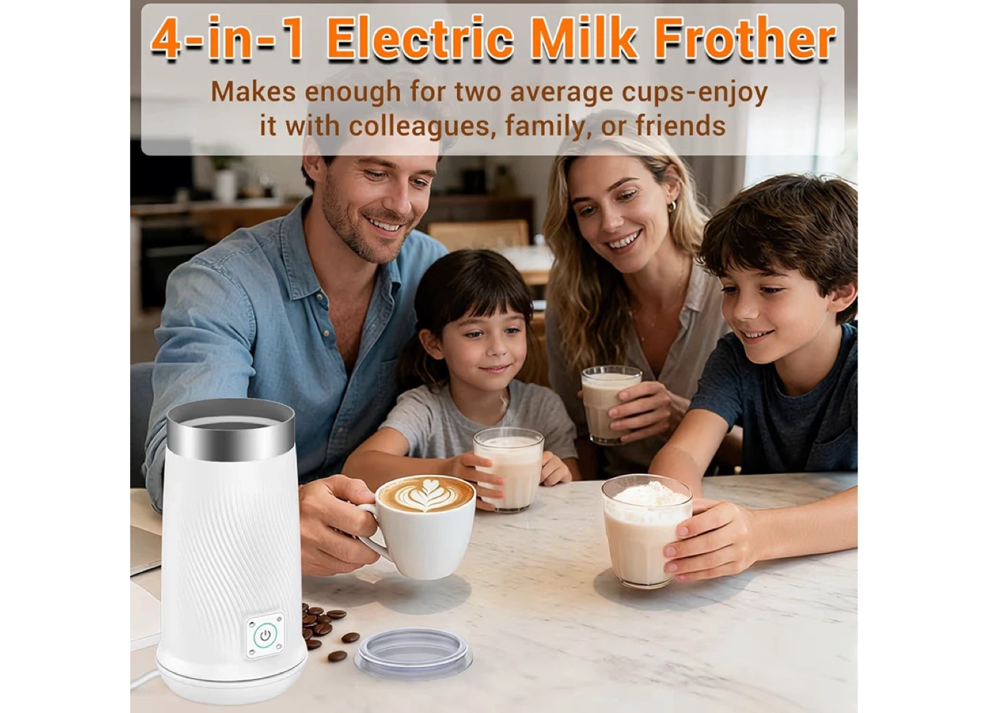This is a WOWTEAM 4-in-1 electric milk frother. It makes enough for two average cups, perfect for lattes, cappuccinos, hot milk, hot chocolate, and iced coffee. Features include one-button operation and automatic shut-off.