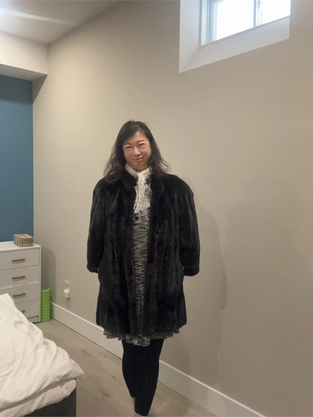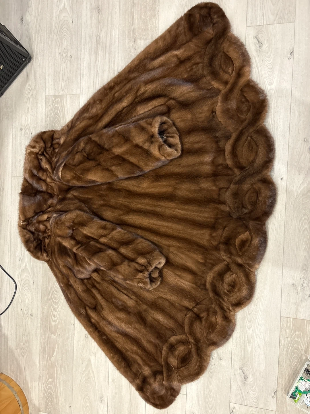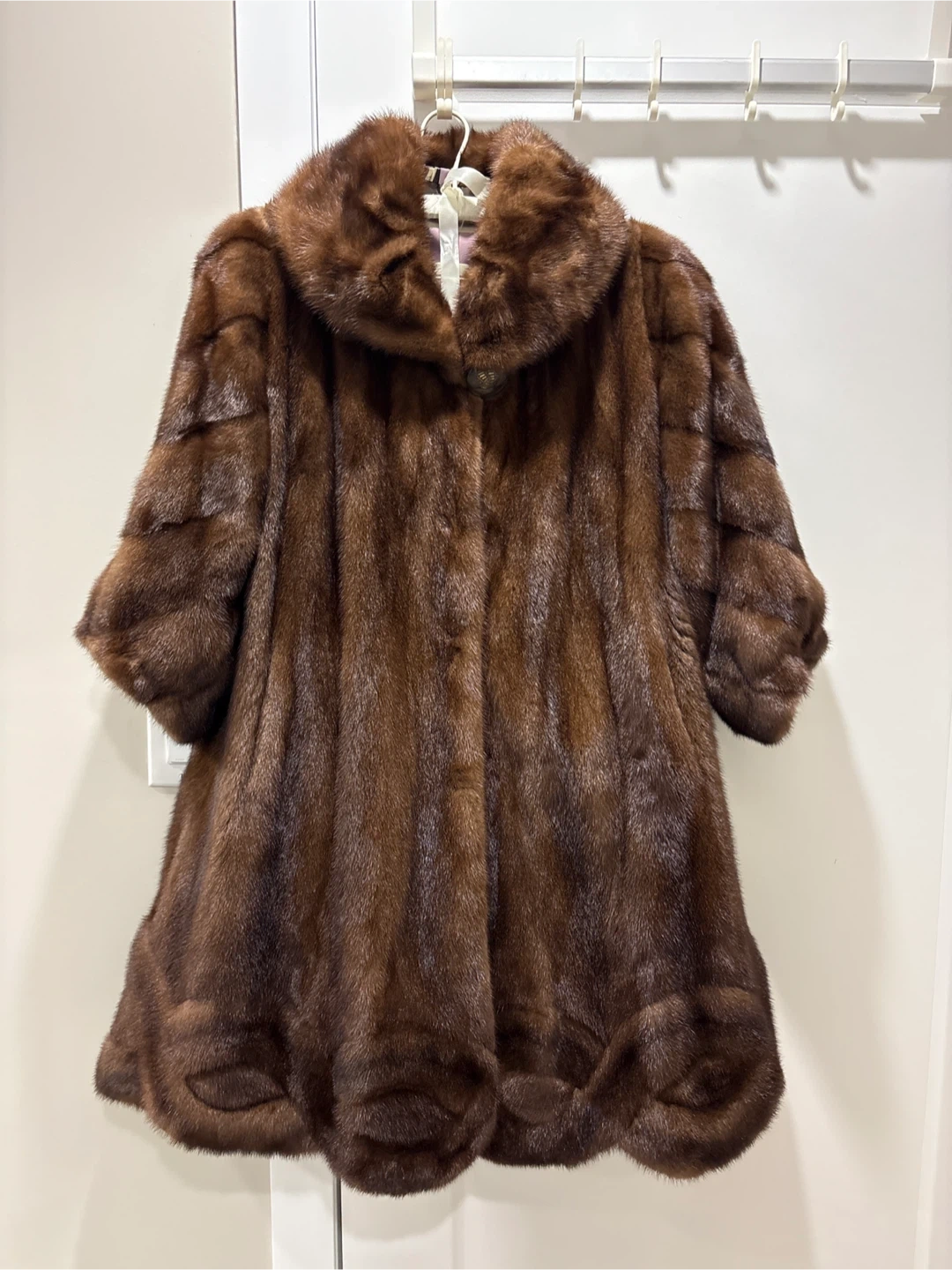 A luxurious brown mink fur coat. It has a classic collar and three-quarter sleeves. This coat is perfect for staying warm and stylish on cooler days!