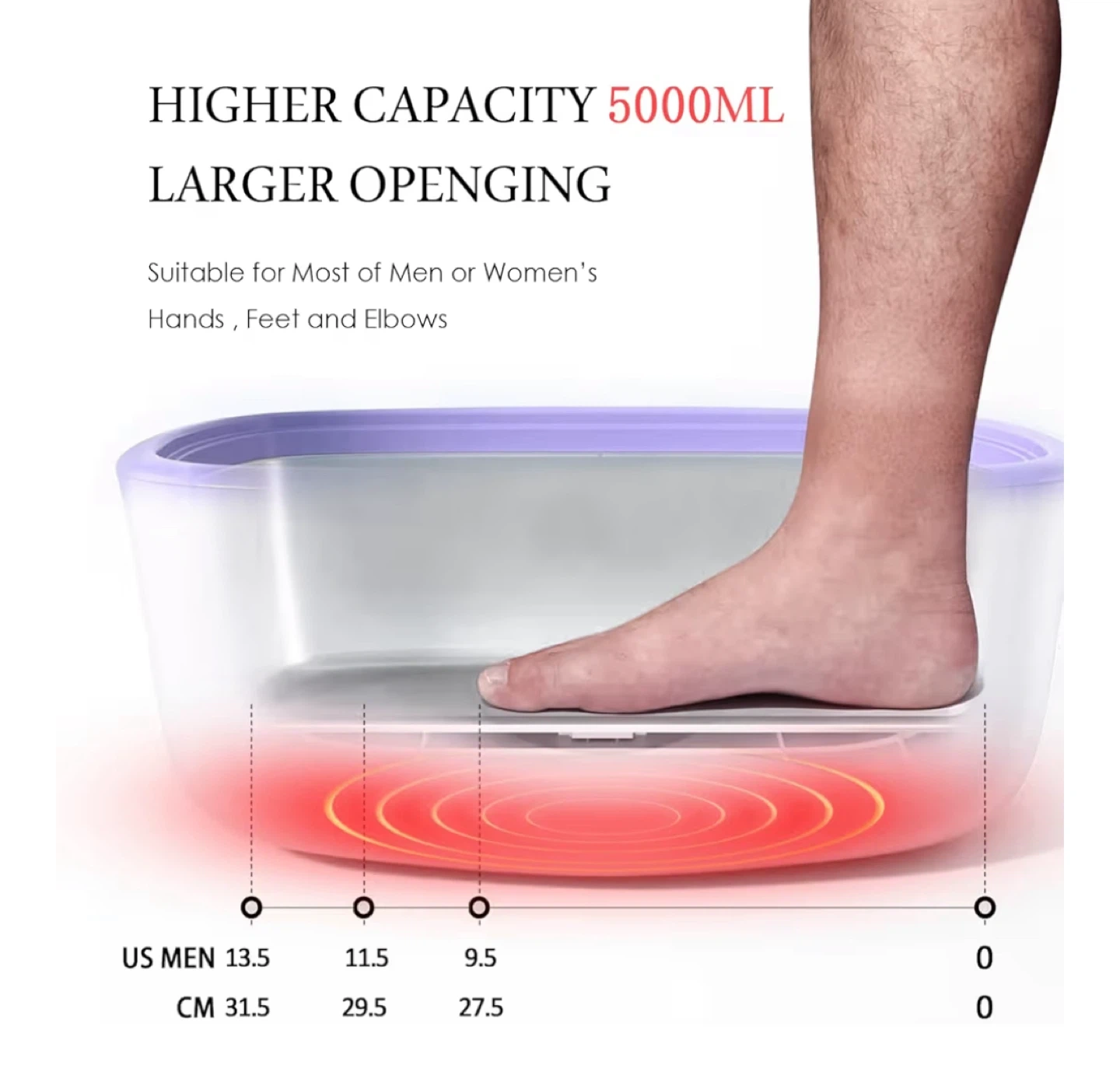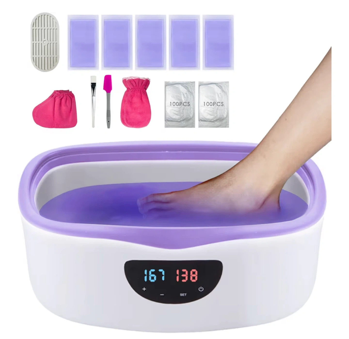 This paraffin wax warmer is designed for moisturizing and skin-softening treatments at home. It has a higher capacity of 5000ml and a larger opening, suitable for hands, feet, and elbows. The kit includes wax blocks, gloves, brushes, and plastic bags.