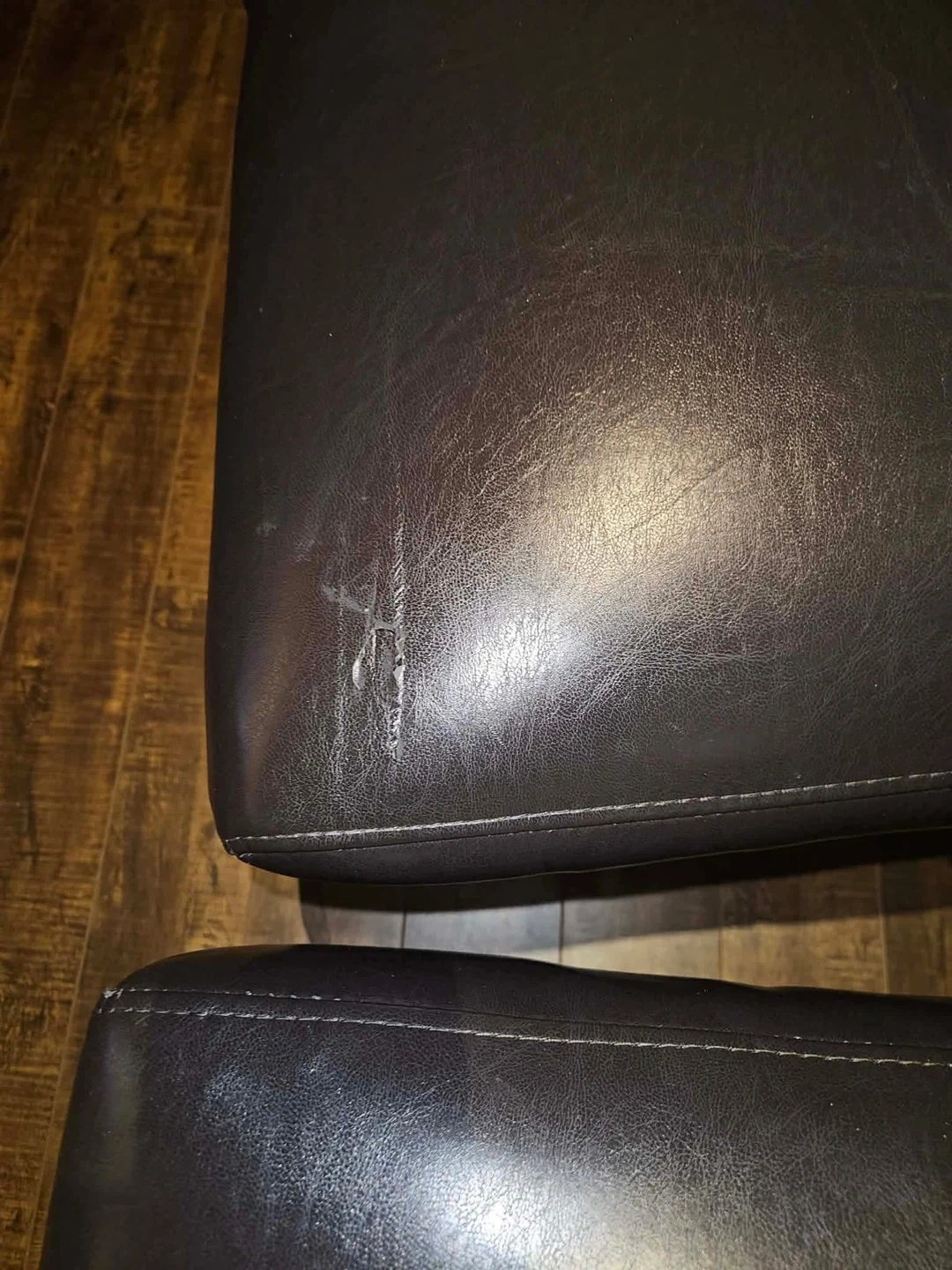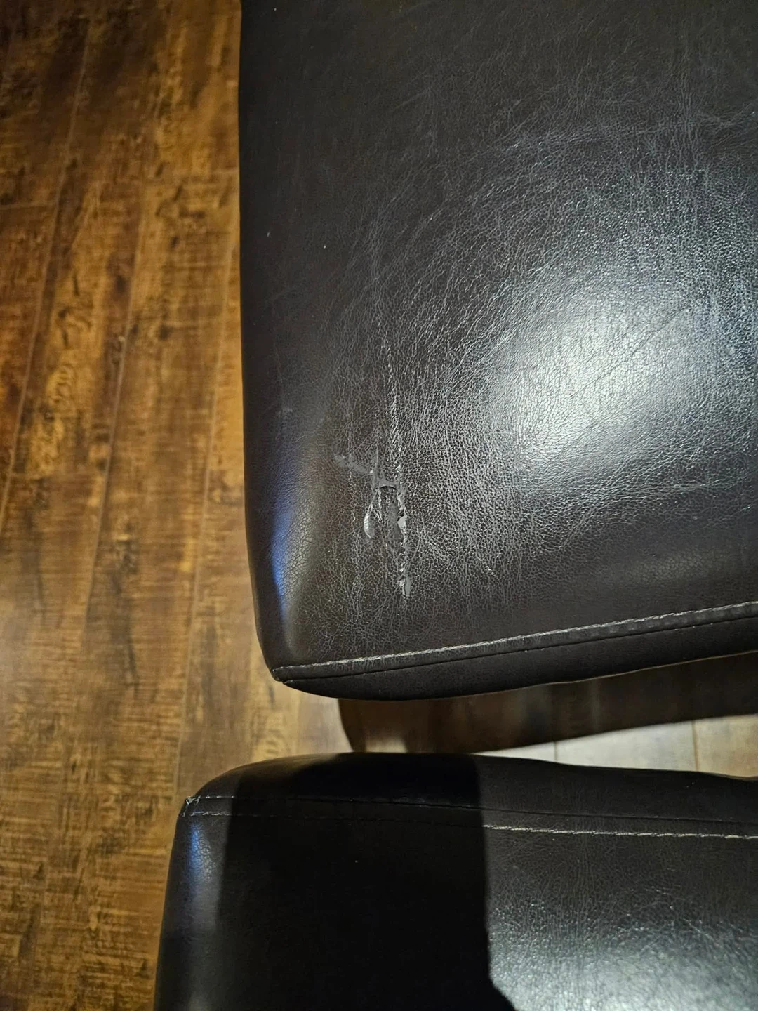 Four dining chairs with dark brown faux leather upholstery. Some minor scuffs and a small tear are present on one of the chairs. Wooden legs provide stability.