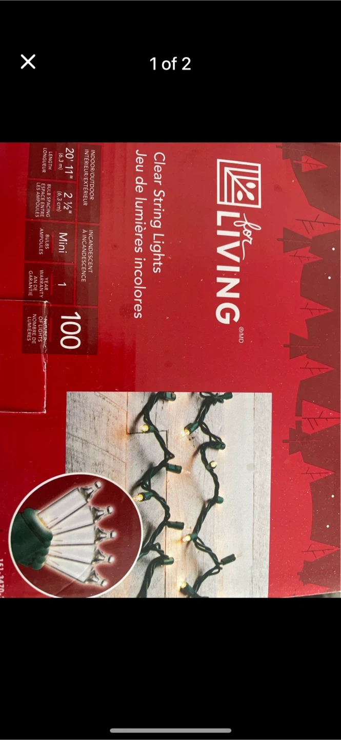 This is a box of 100 clear mini incandescent string lights from for LIVING. They're suitable for indoor or outdoor use. The string measures 20' 11" in length with 2 1/2" bulb spacing. Perfect for decorating for the holidays!