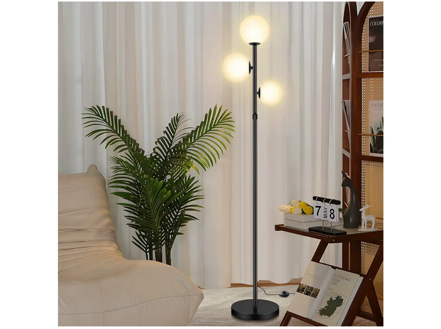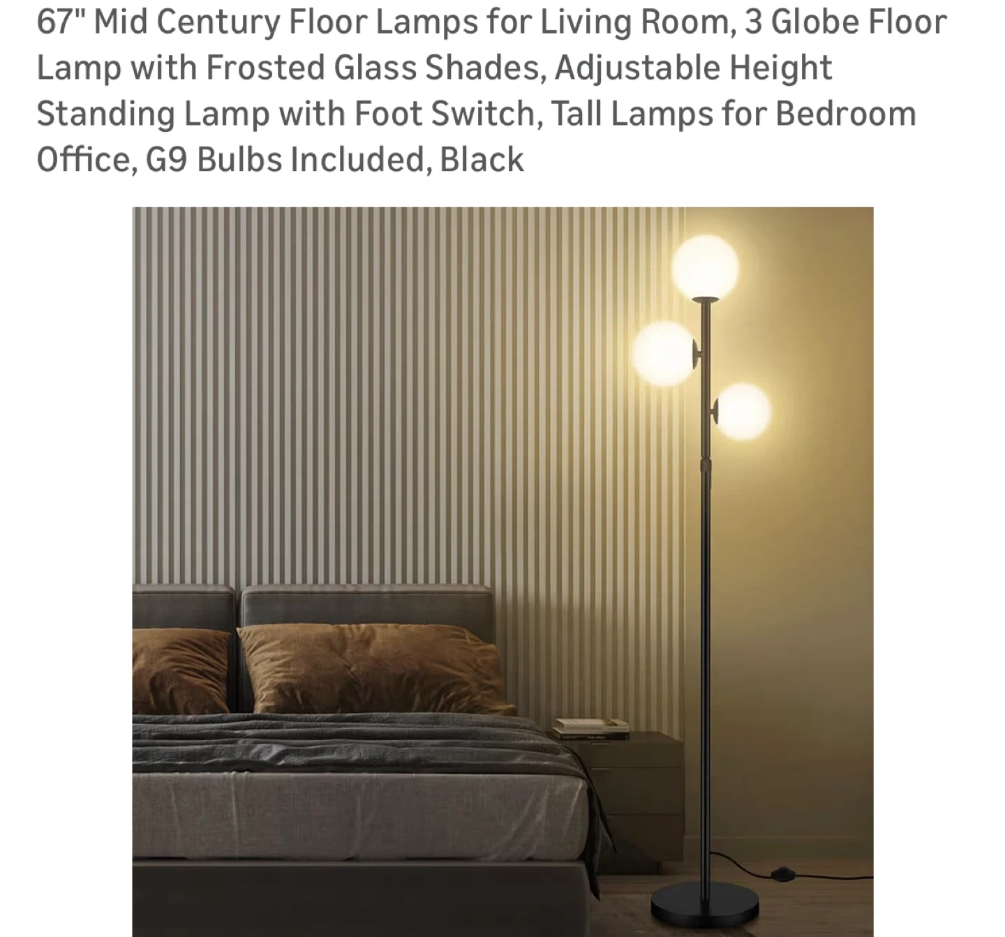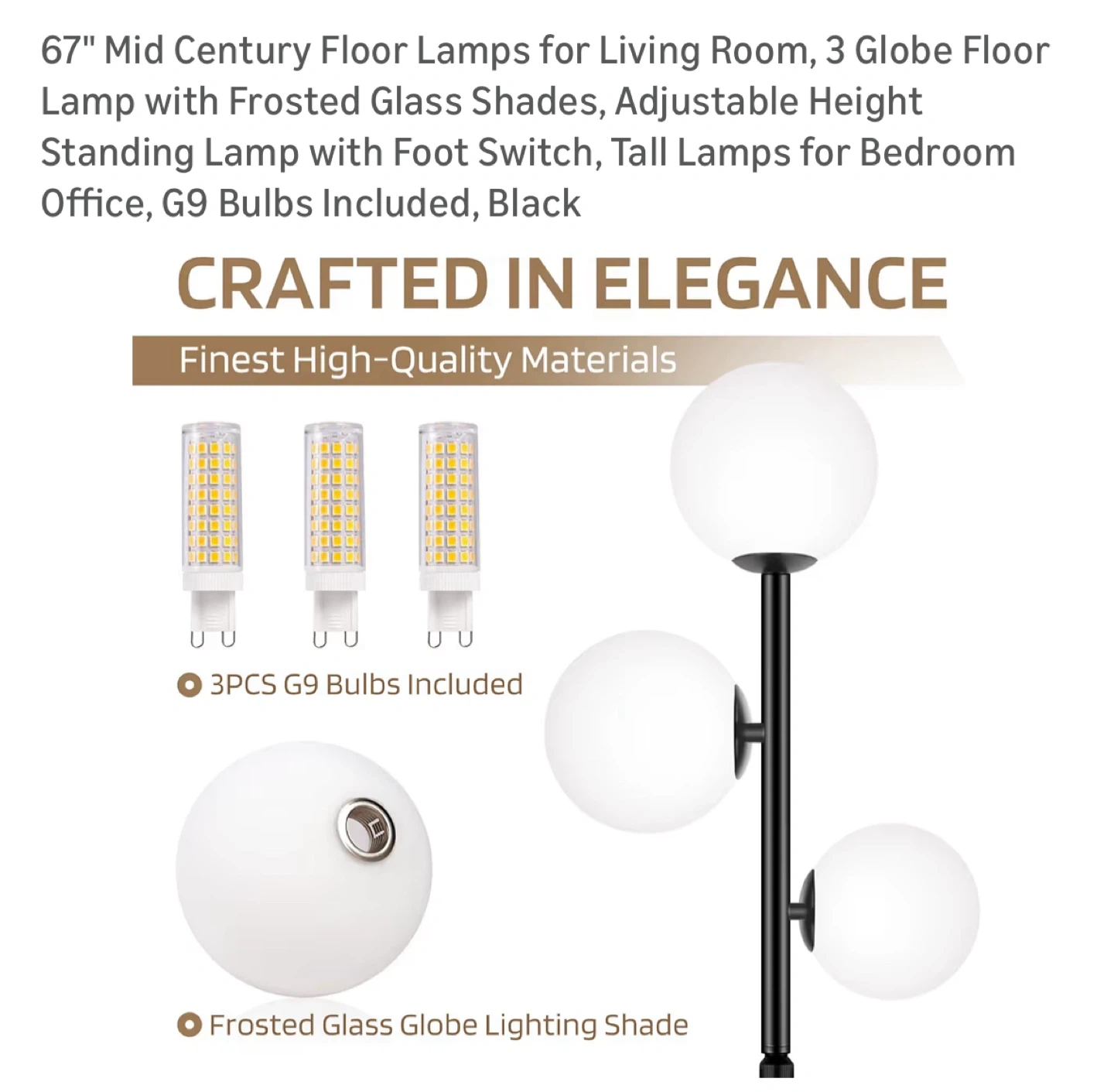 This 67-inch floor lamp features three frosted glass globe shades and an adjustable height. It has a convenient foot switch and includes G9 bulbs. It's a tall lamp suitable for a bedroom or office.