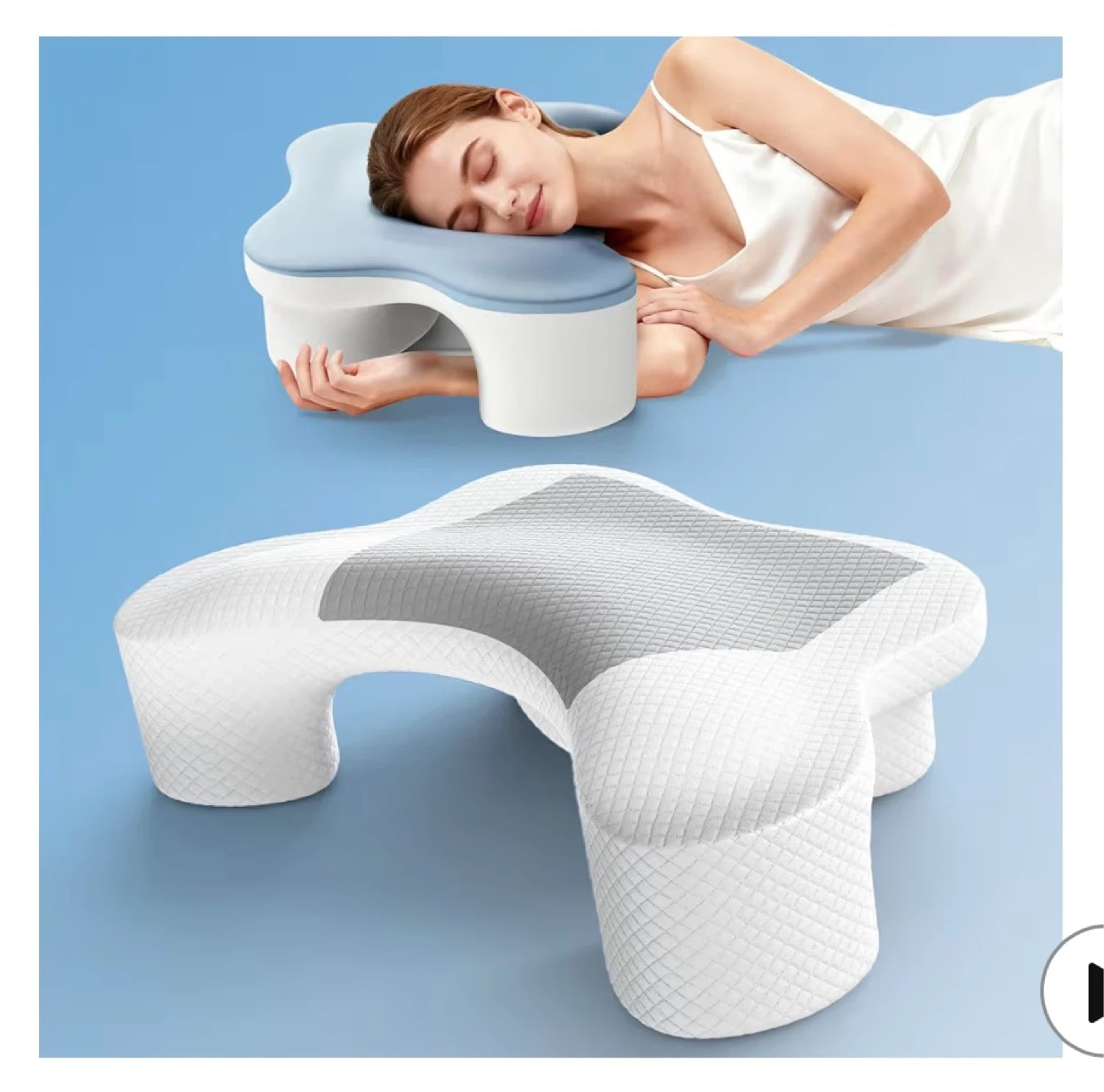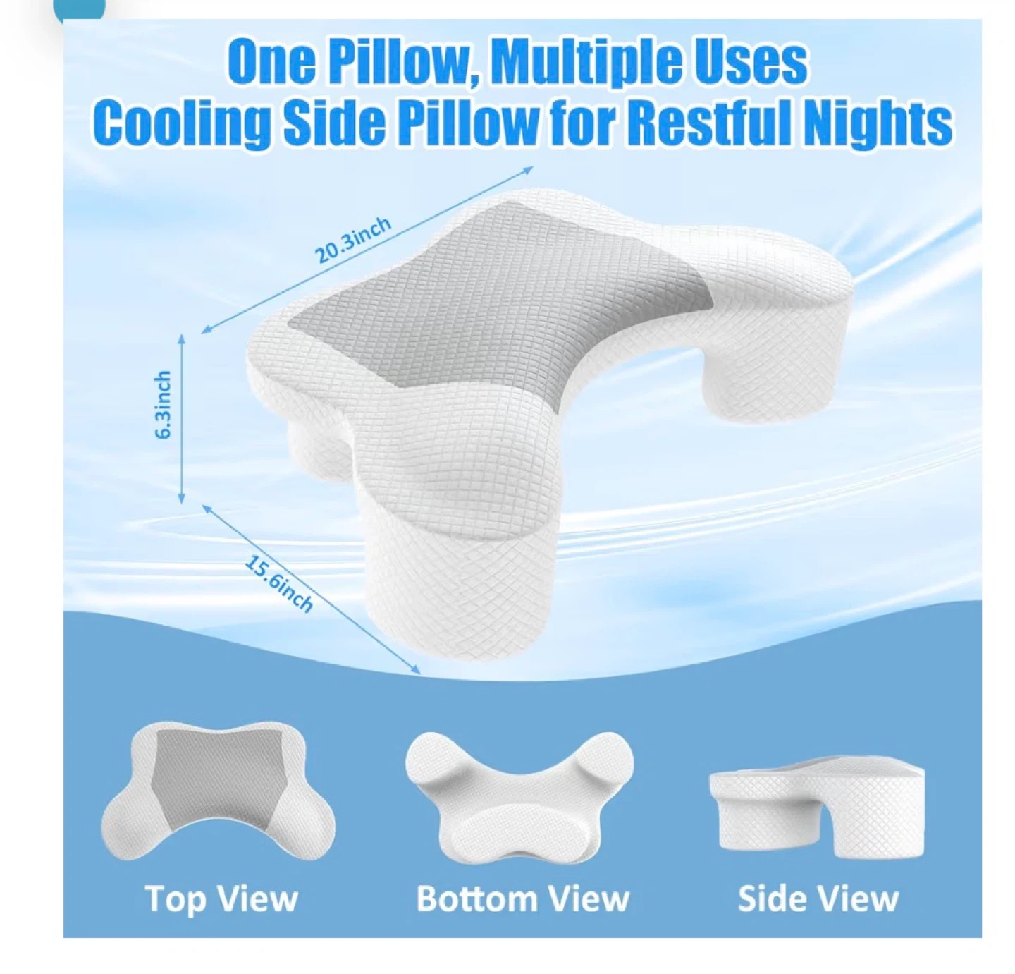 This cooling side pillow is designed for comfortable sleep. It features a unique shape that supports side sleeping. Dimensions are 20.3 inches long, 15.6 inches wide, and 6.3 inches high. The pillow offers a cooling sensation for restful nights!