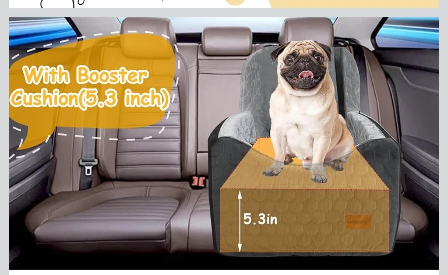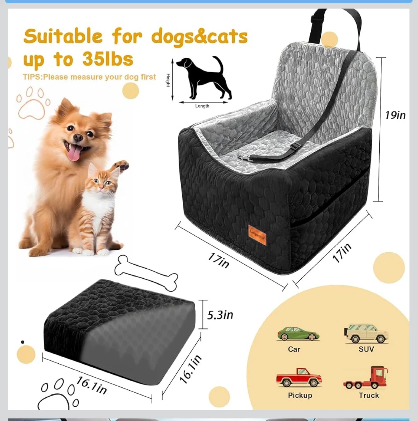 Keep your furry friend safe and comfortable during car rides with this versatile dog car seat. It features a 5.3 inch booster cushion for extra height and includes a safety strap. Made from high-quality material. Suitable for dogs and cats up to 35lbs.