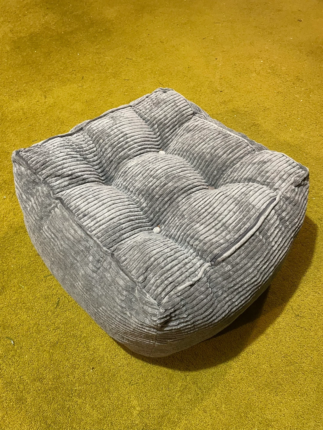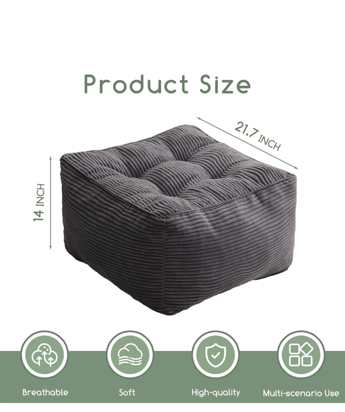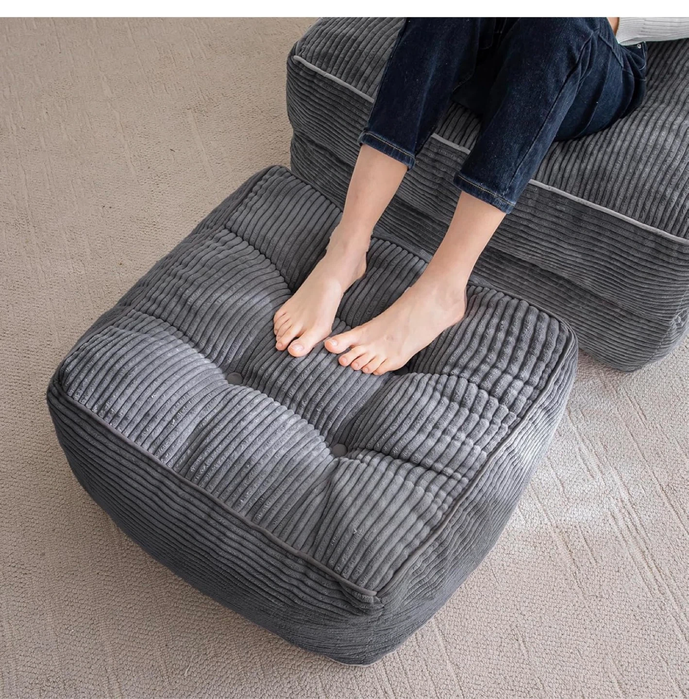 This gray corded fabric pouf ottoman comes with a matching footrest. It features a tufted design with shredded foam filling for comfort. Dimensions are 21.7 inches wide by 14 inches high.