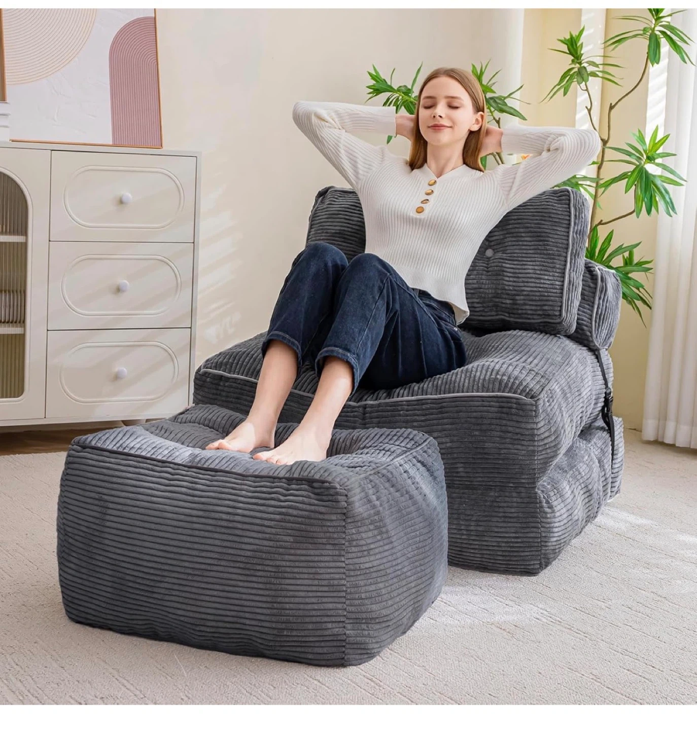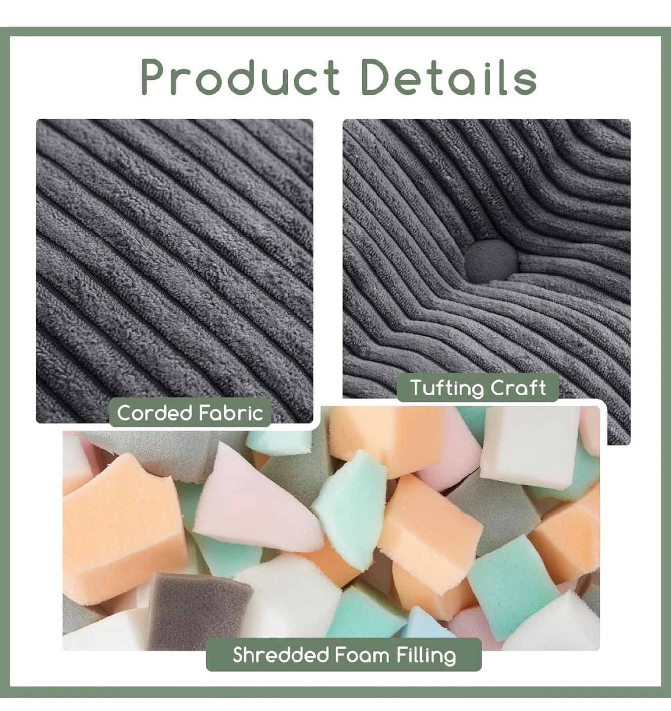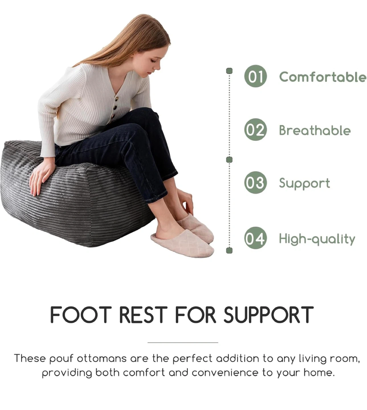 This gray corded fabric pouf ottoman comes with a matching footrest. It features a tufted design with shredded foam filling for comfort. Dimensions are 21.7 inches wide by 14 inches high.