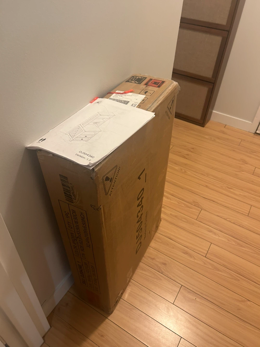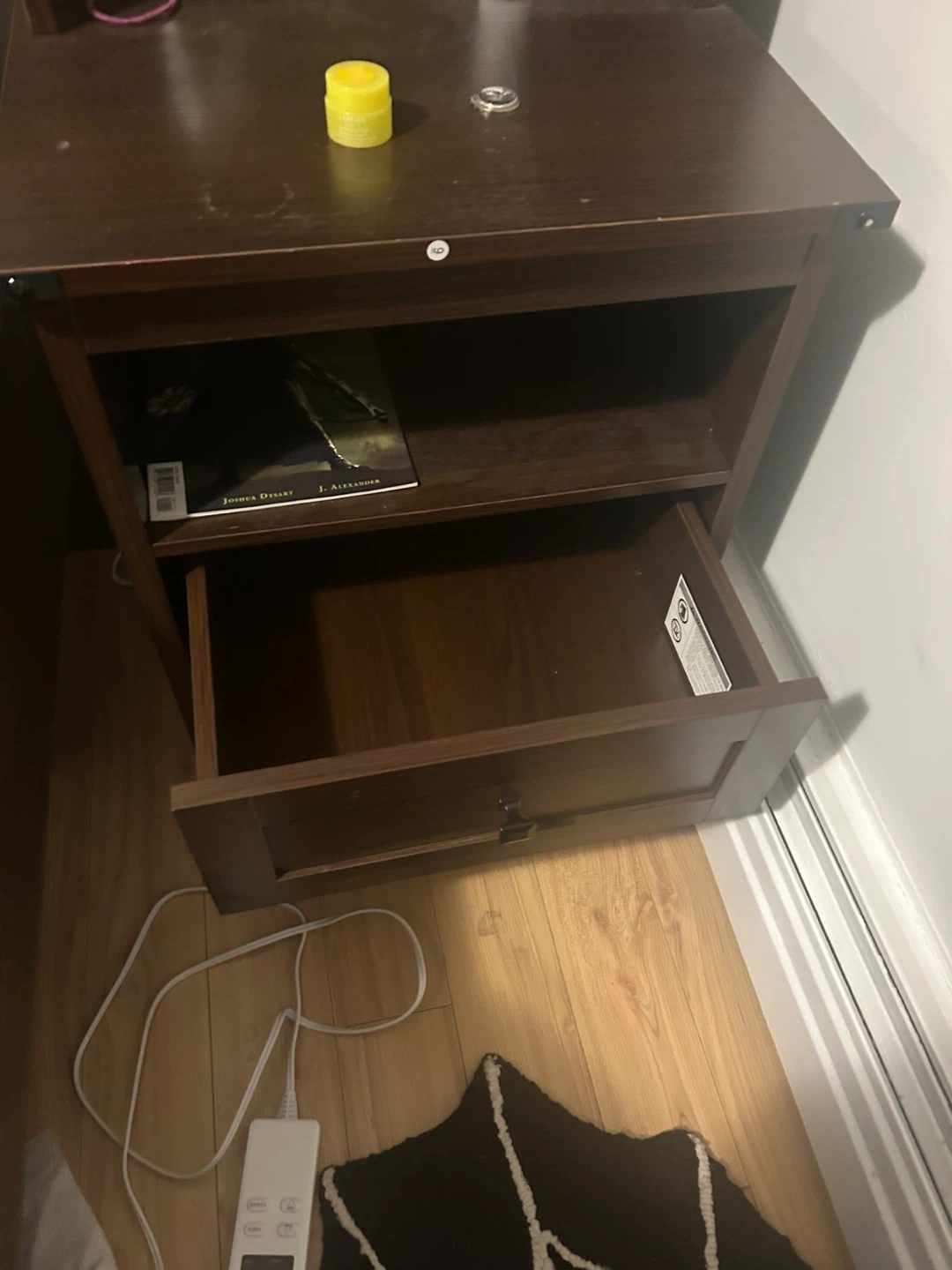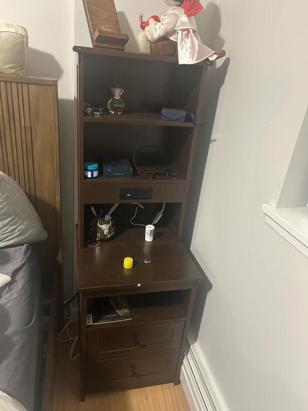 This dark wood bedside table features a built-in charging station with outlets and USB ports. It includes a drawer for storage and an open shelf above. It's perfect for keeping your bedroom tidy and devices powered up! Super cute just ended up being darker than anticipated. Our loss is your gain. One is built, one is still in the packaging.
