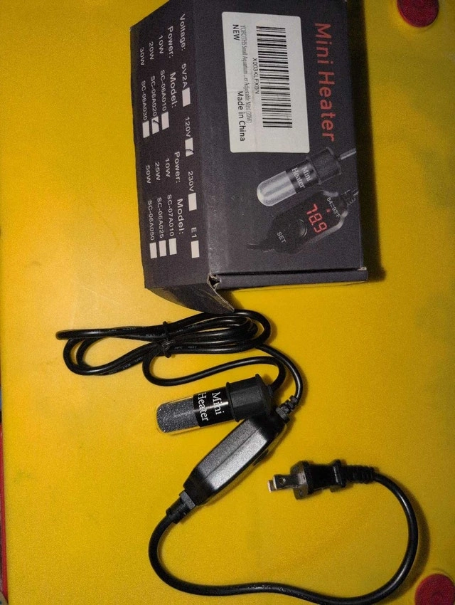 This Mini Heater is a compact and efficient solution for fishtank heating needs, operating within a temperature range of 64-93°F. This item is new and comes with its original box. It's small, it's mighty, and it's ready to keep your fish cozy. If the ad's up, it's still available!