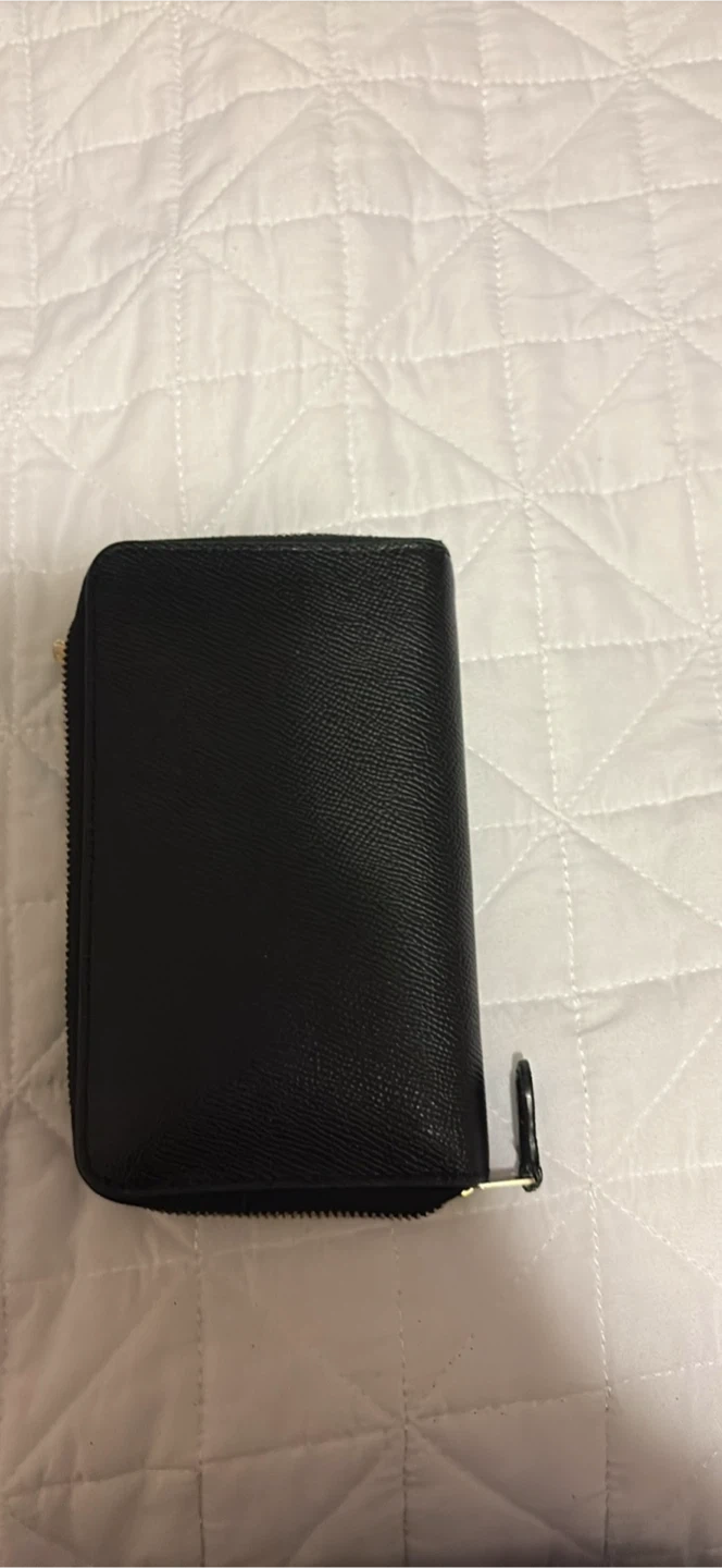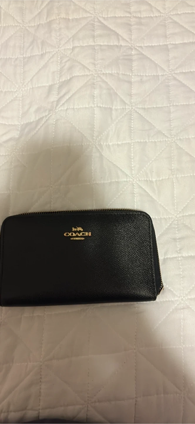 This is a Coach black leather zip-around wallet. It features multiple card slots and a zippered compartment inside. Genuine leather construction.