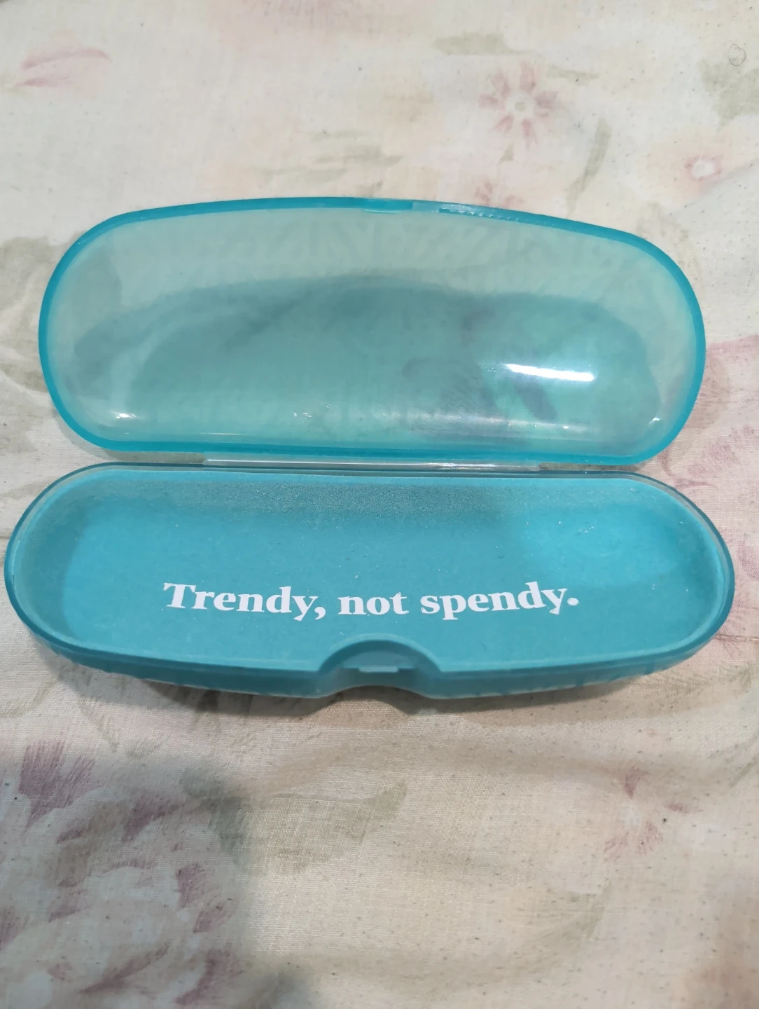 Hard eyeglass case in a teal colour, featuring the Zenni logo and the slogan 'Trendy, not spendy.' Includes a PD ruler for measuring pupillary distance. Case is made of plastic. Case is in great condition perfect for keeping your glasses safe