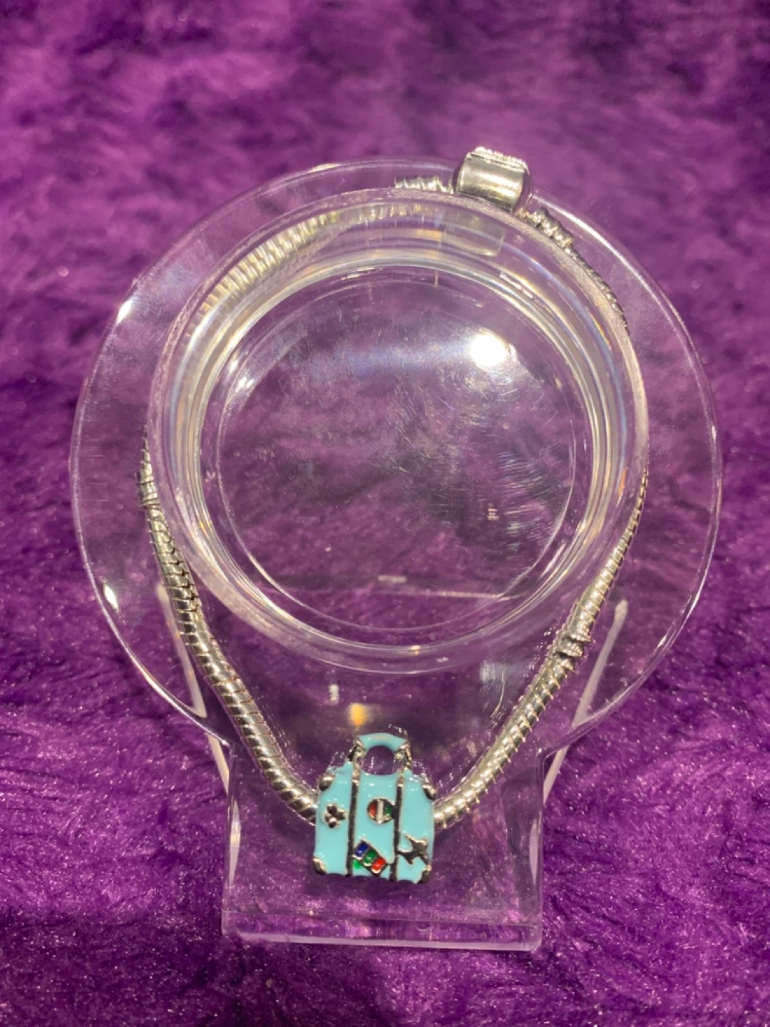 This is a sterling silver S925 bracelet with silver charm featuring a blue suitcase charm. The charm has colourful details like a passport and stickers. It's a fun accessory for travellers!
