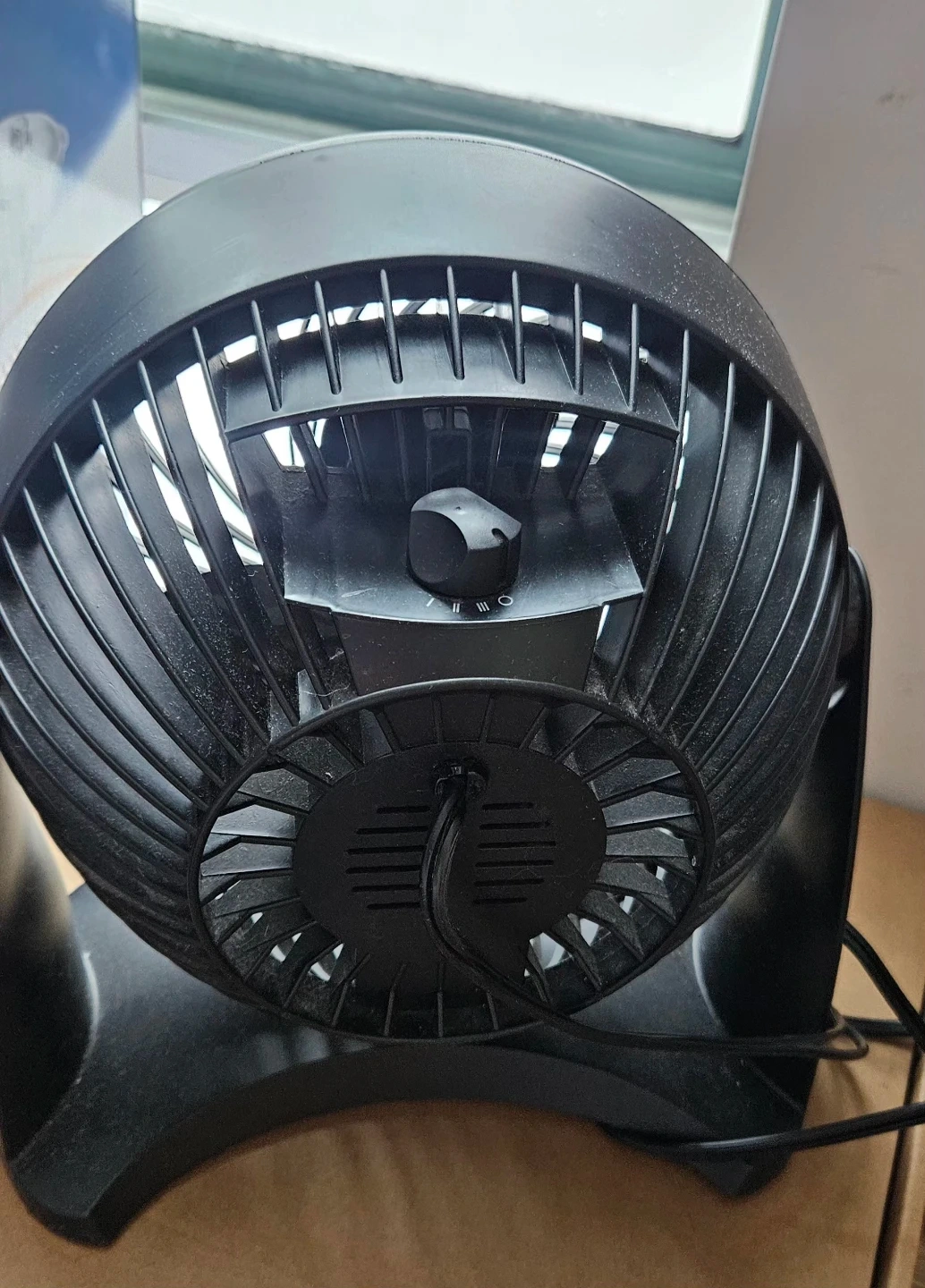 This Honeywell desk fan is black and has multiple speed settings controlled by a dial. It's great for personal cooling. It has a sturdy base for stability.