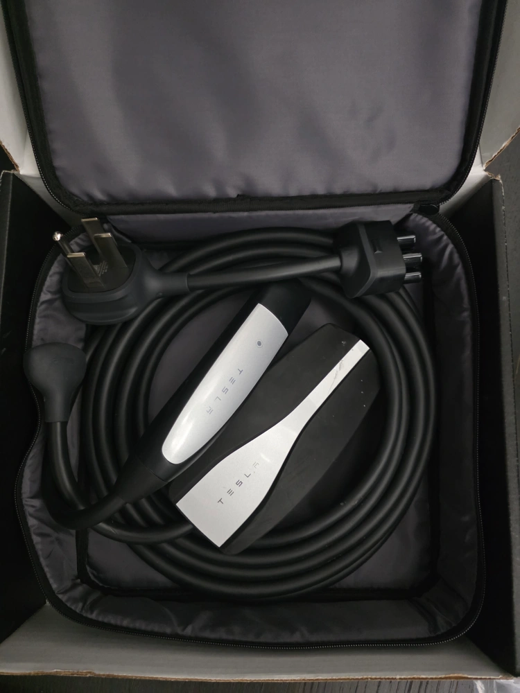 This is a Tesla Mobile Connector. It comes with a travel bag and all original components. It's perfect for charging your Tesla on the go!