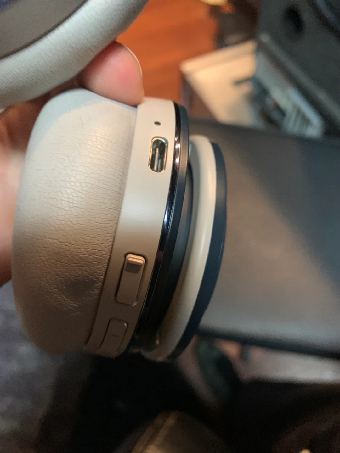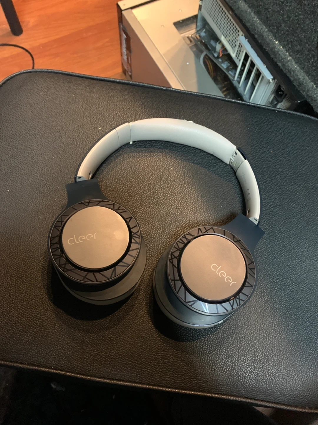 These are Cleer headphones in a light grey colour. The earcups are beige faux leather. They feature a USB-C charging port. Some wear is visible on the headband and earcups.