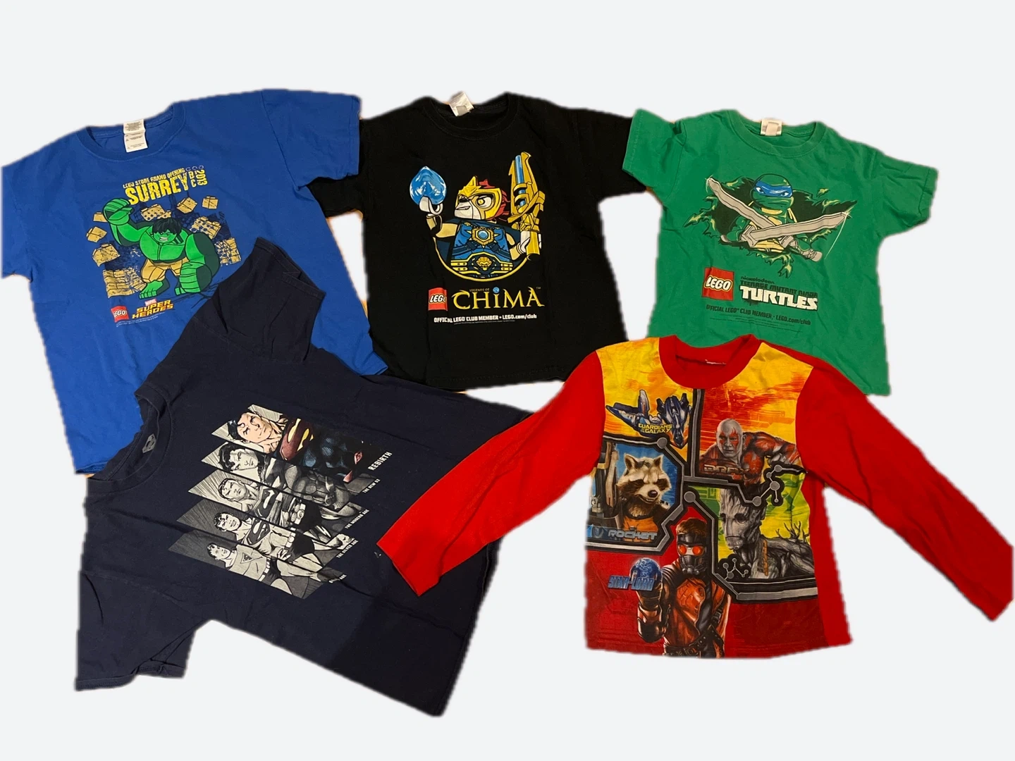 This bundle includes four t-shirts featuring popular characters. There's a dark blue shirt with DC Comics heroes like Superman and Batman, a blue shirt with the Hulk (size L), a black shirt with LEGO Chima characters (size S)and a green shirt with LEGO Teenage Mutant Ninja Turtles(size S)The red long-sleeved shirt has Guardians of the Galaxy graphics(size 10-12). Sizes reference guide from Gildan Tshirt