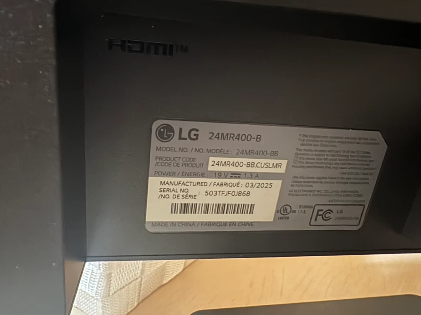 LG 24MR400-B monitor. Model number 24MR400-BB. Power input is 19V, 1.3A. Manufactured March 2025. It's a 24-inch display.