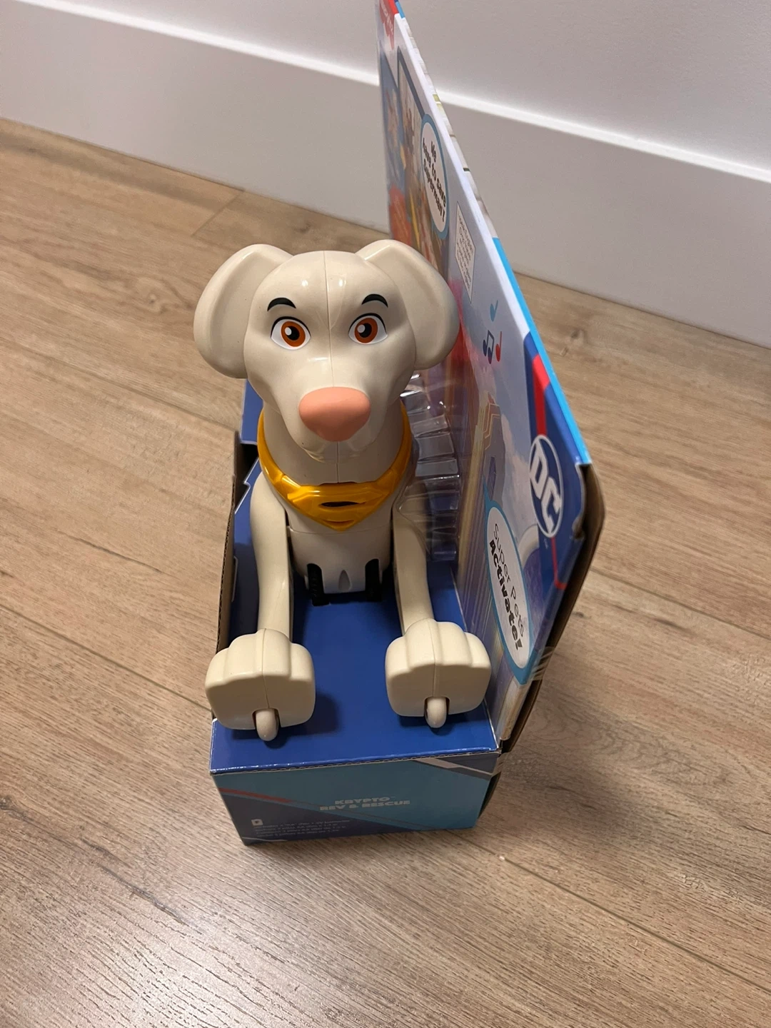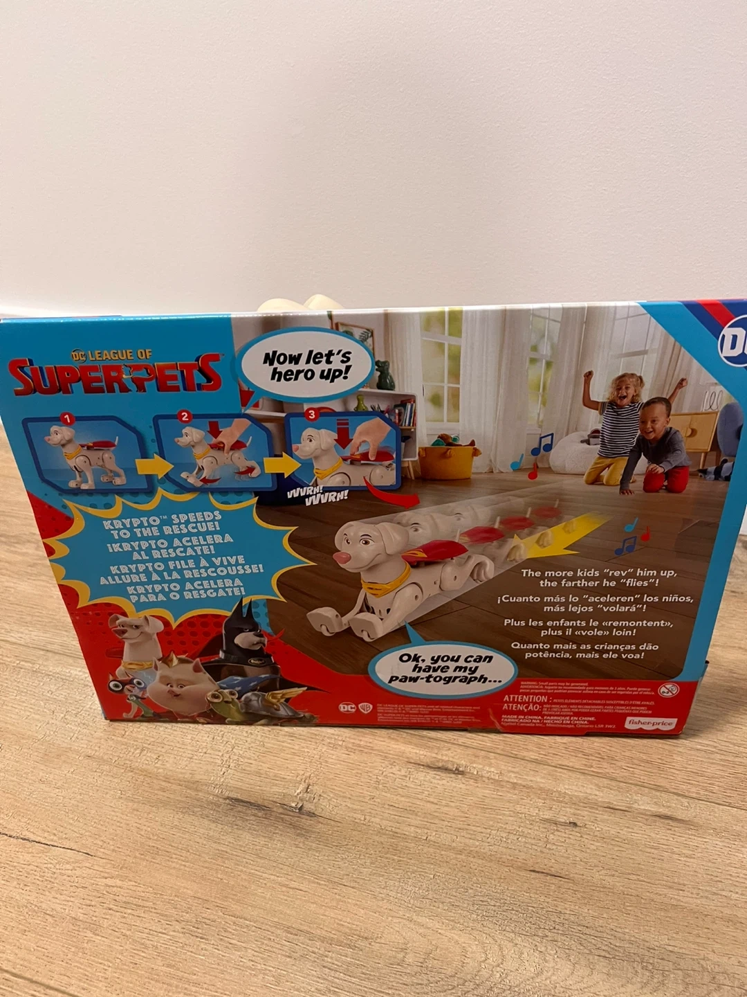 This is the Fisher-Price DC League of Super-Pets Krypto toy with motorized flying action. It's designed for kids to activate and have fun with their favourite superhero dog. It's perfect for young fans of the DC League of Super-Pets.