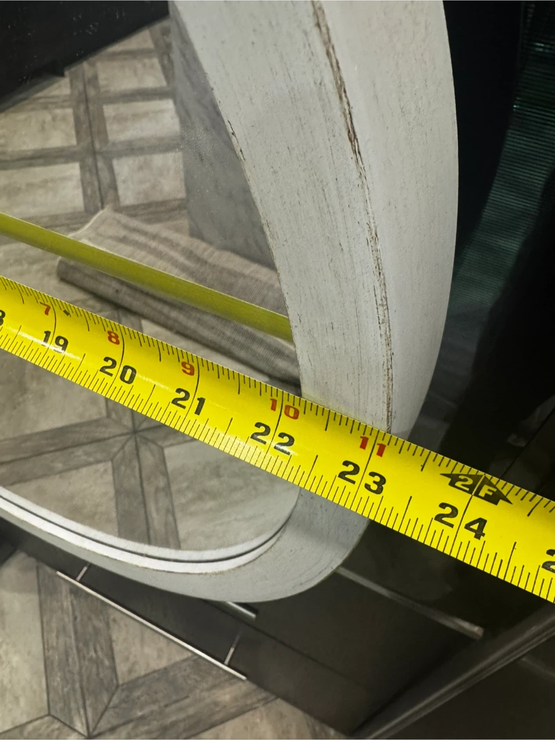 This oval wall mirror features a distressed white wood frame and a rustic rope hanger. It's approximately 21 inches in diameter. Add a touch of charm to any room!