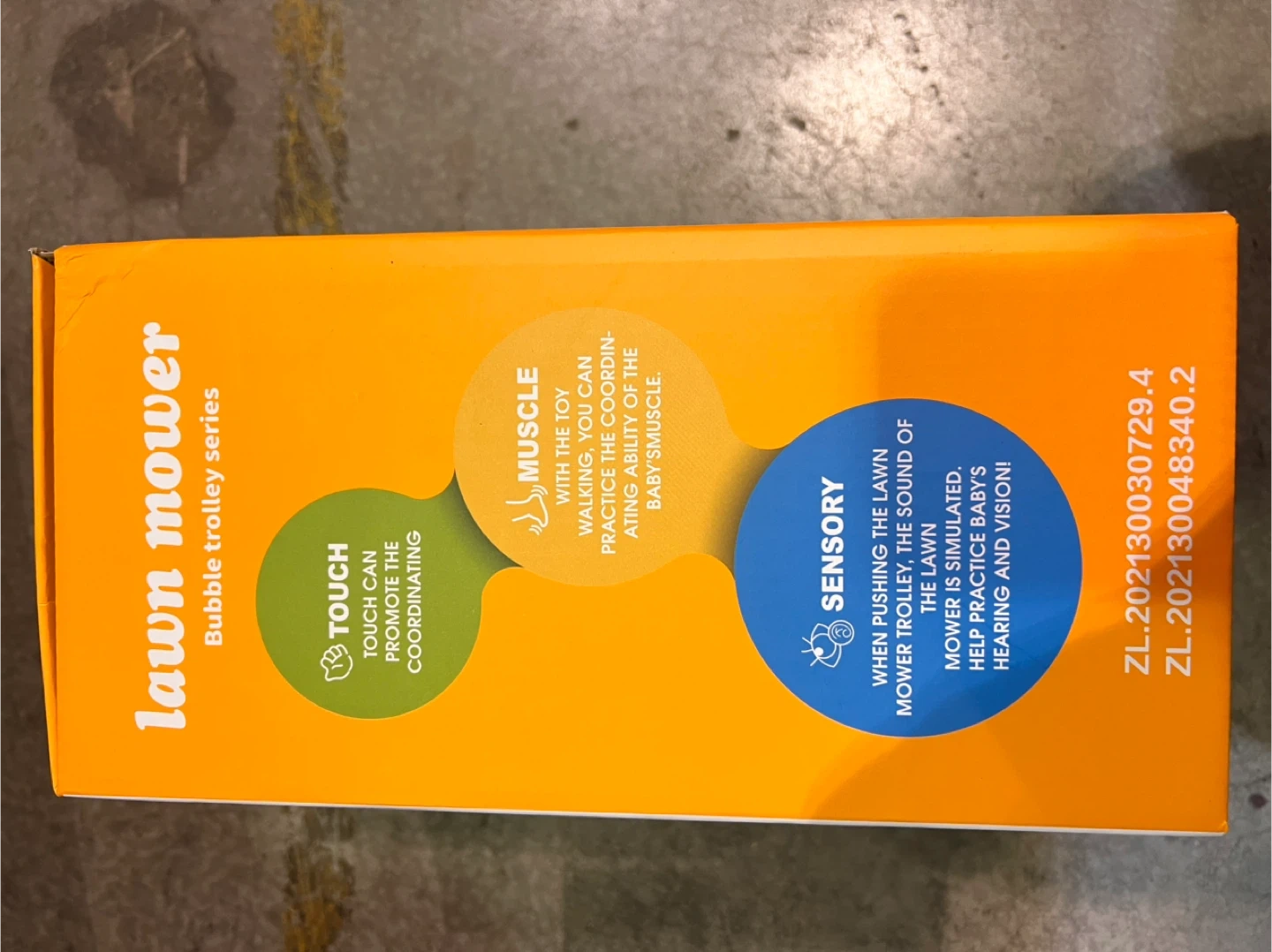 This is a fun bubble lawn mower toy. It's designed for children aged 3 and up. Pushing the mower creates bubbles and makes noise, promoting sensory development.