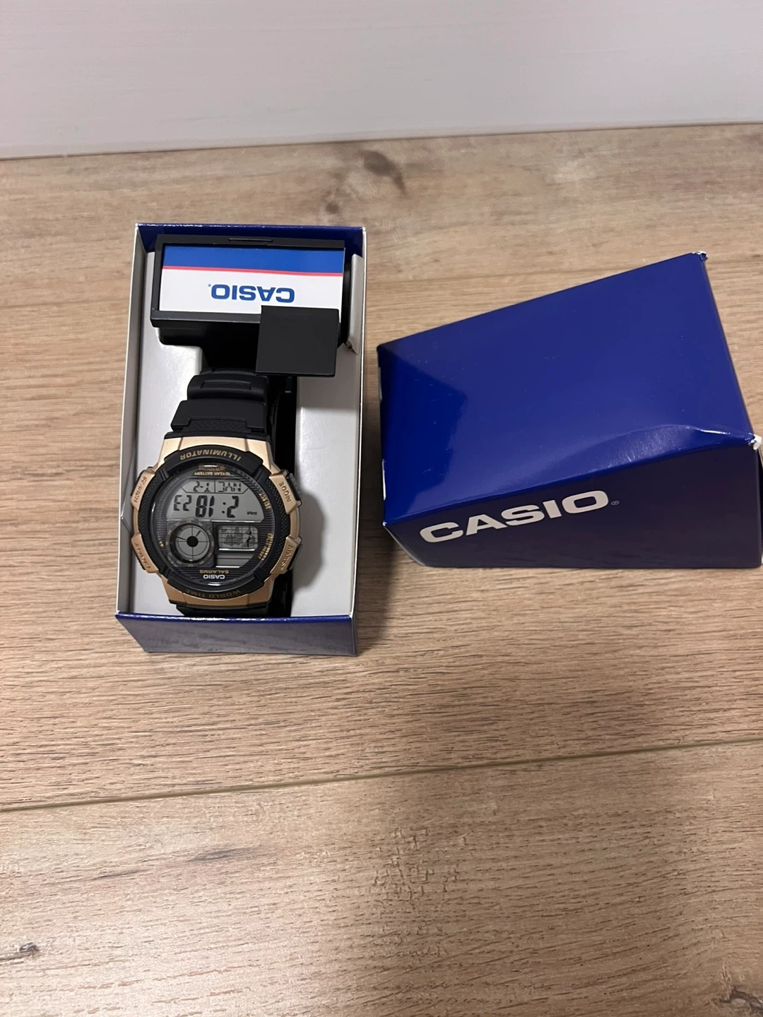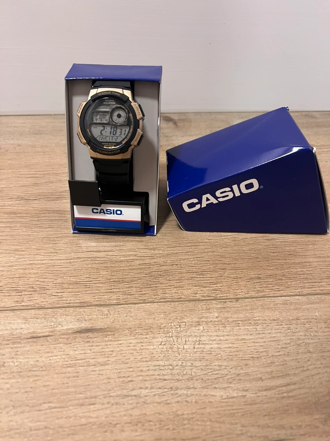 Casio watch in gold and black. It features an illuminator and comes with its original box. This watch is a great choice for everyday wear.