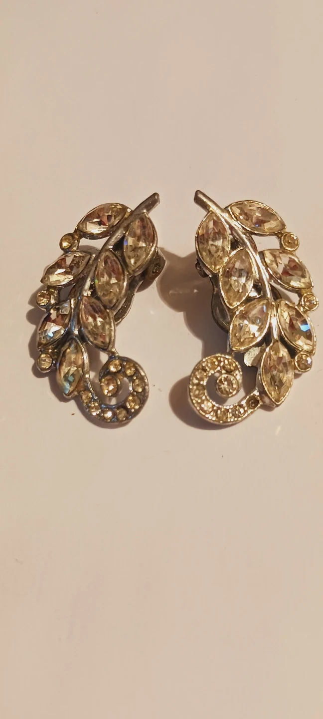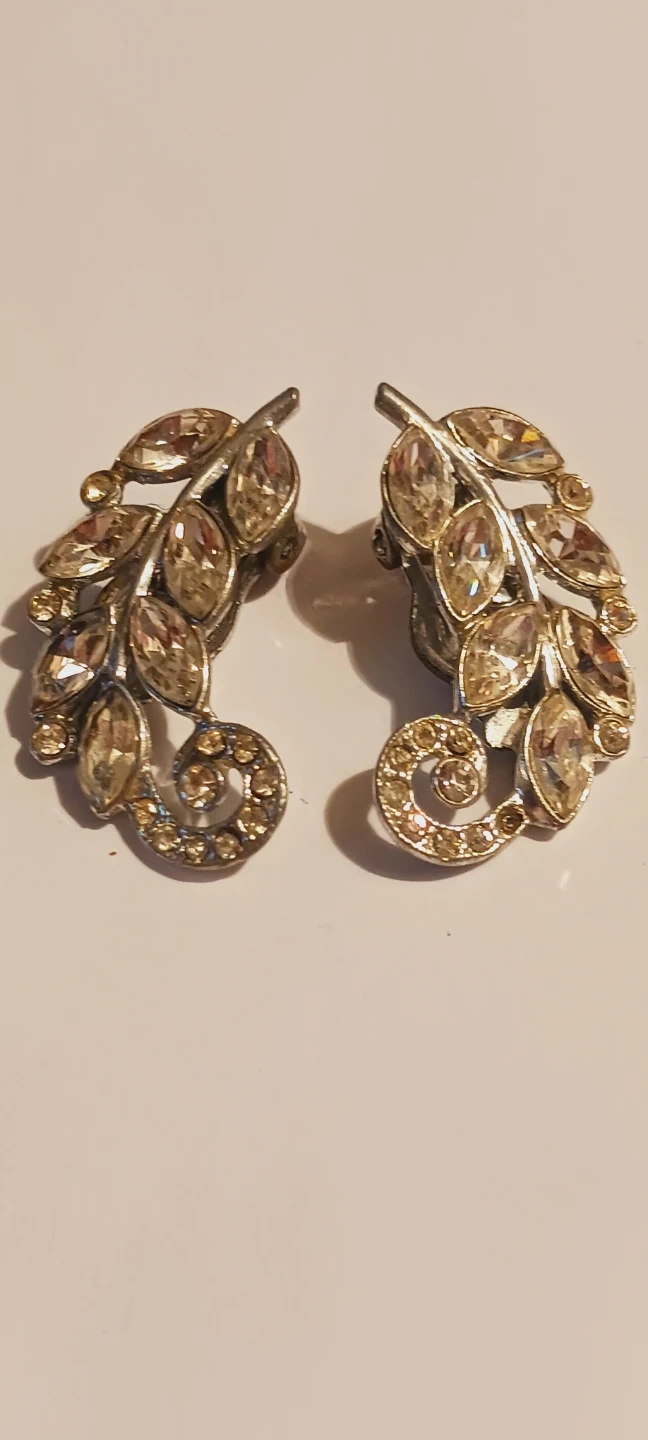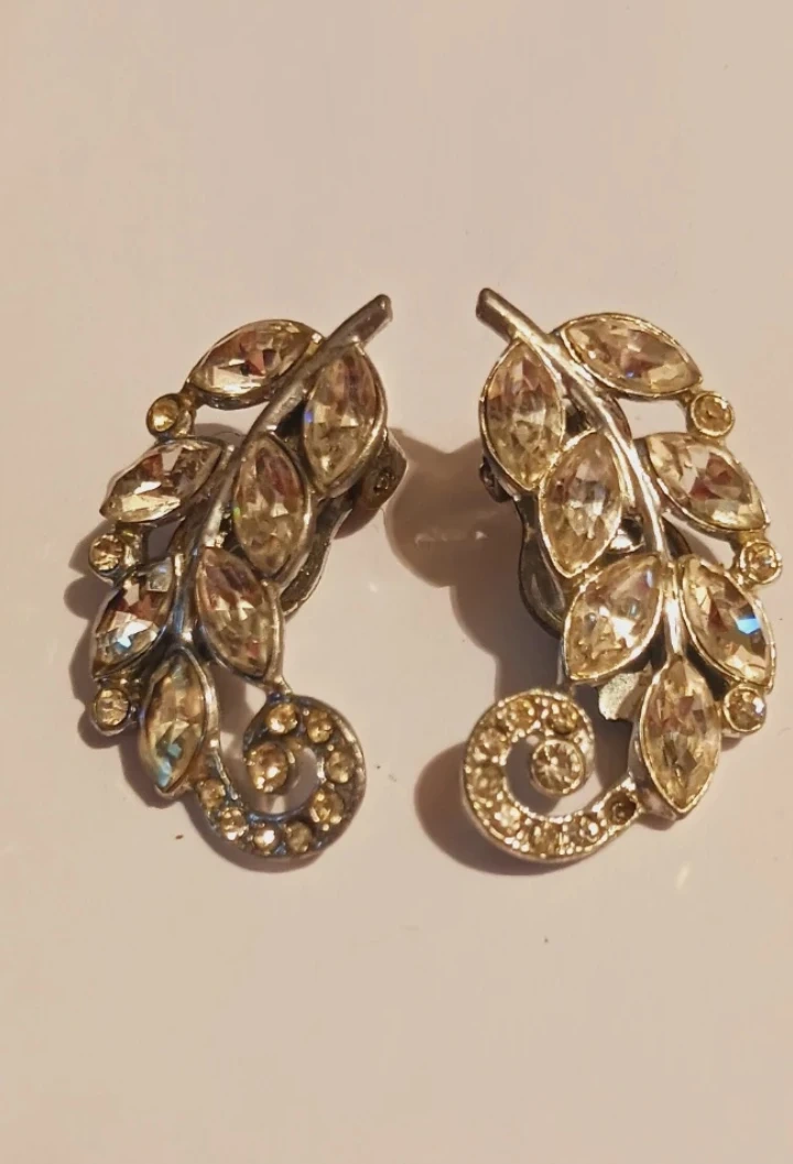 Art Deco Charming Vintage Sparkling ✨️ rhinestone earrings designed like detailed leaves with a swirl accent. These are clip-on style earrings. Excellent condition. 1.5"×1". ALL MY PRICES ARE NEGOTIABLE !!