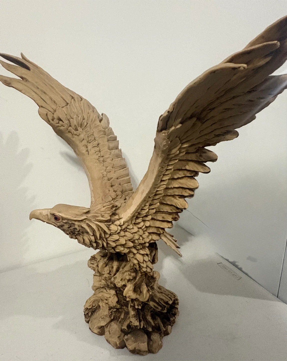 This is a beautifully carved wooden statue of an eagle. It's mounted on a rock base, showing incredible detail in its feathers and wings. The ceramic has a natural finish.