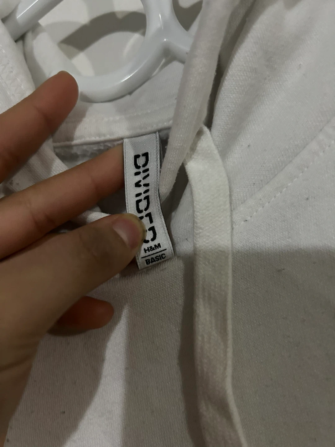 This is a white H&M hoodie with a small 'love' graphic on the chest. It's a size medium and has a front pouch pocket. There are some faint yellow stains on the front pocket area.