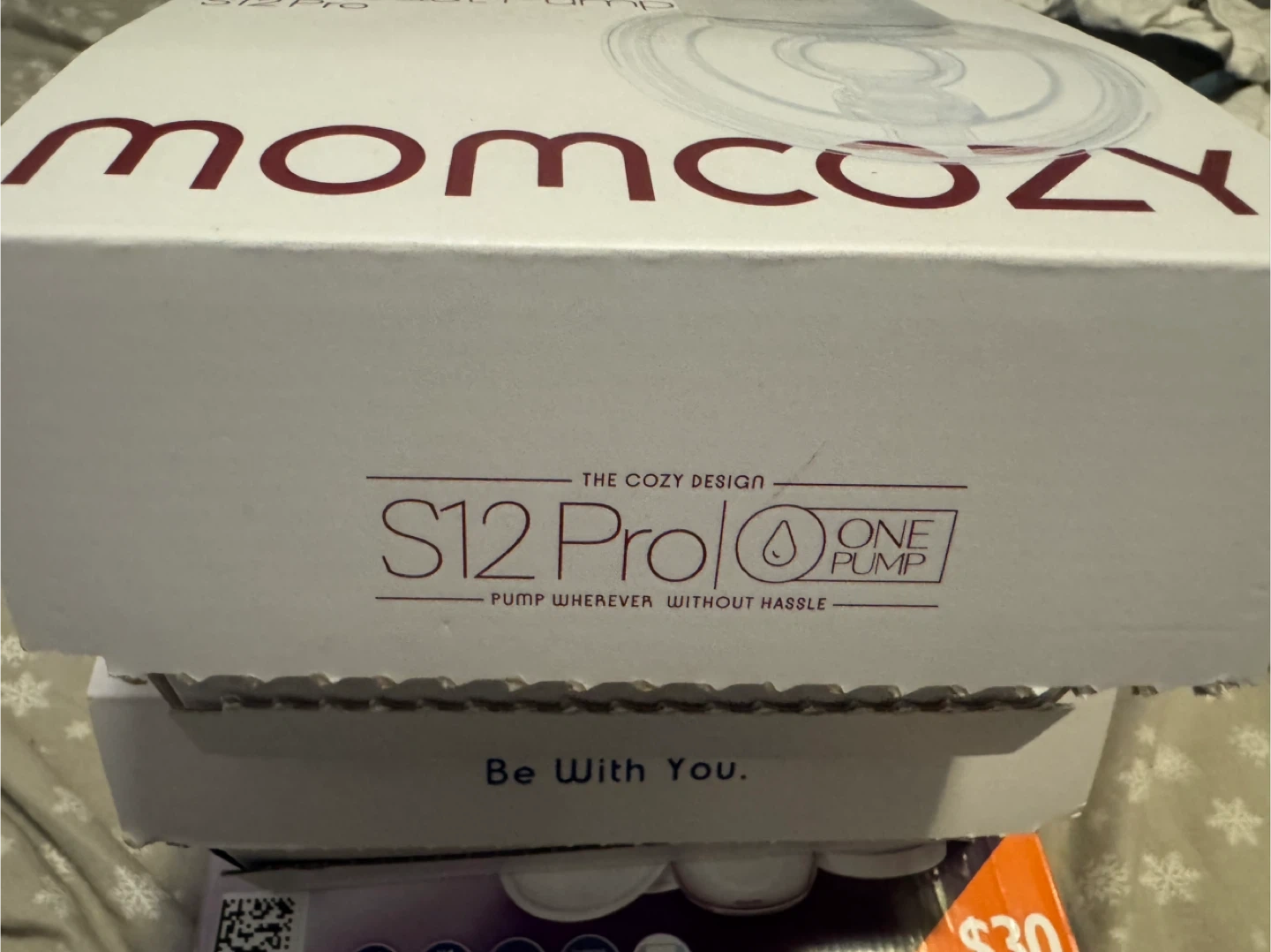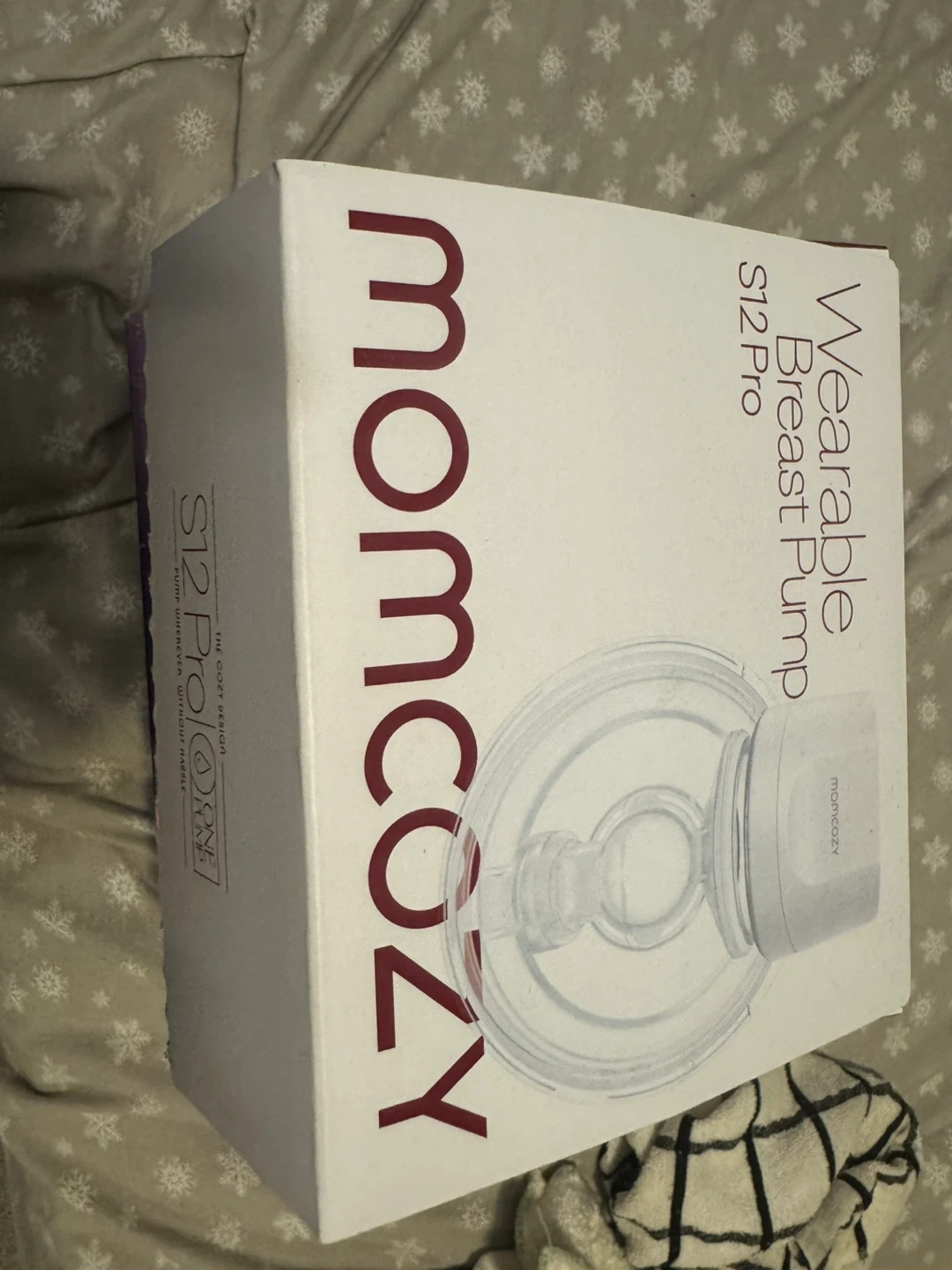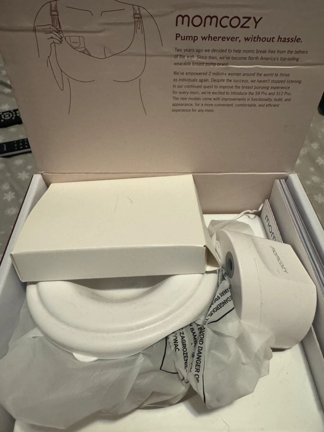 This is a Momcozy S12 Pro wearable breast pump. It's designed for pumping without hassle. The package includes the pump and its accessories.