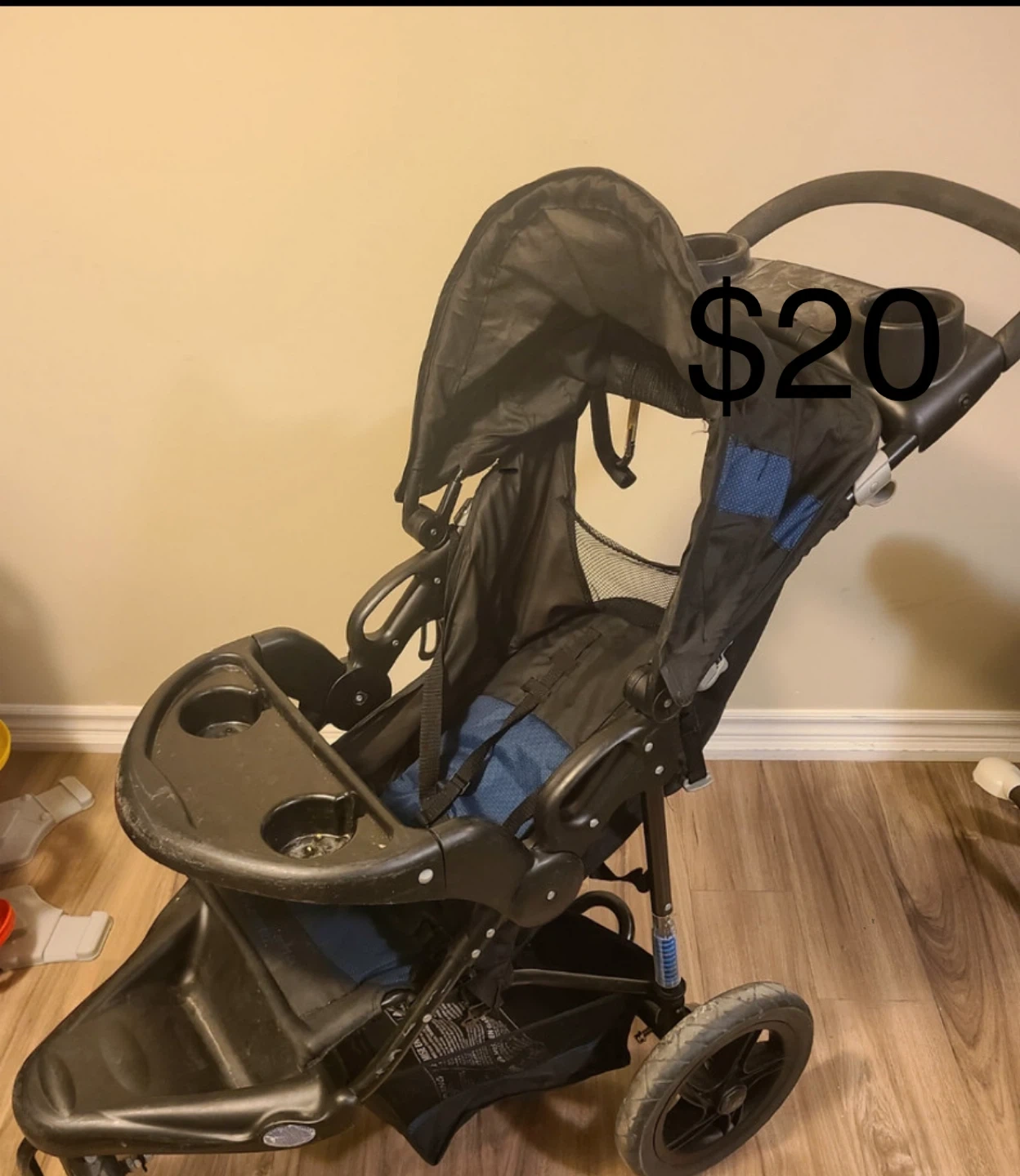 This is a black stroller with a blue seat. It includes a child tray with cup holders and a parent cup holder. The canopy is adjustable. It's a handy stroller for on-the-go!