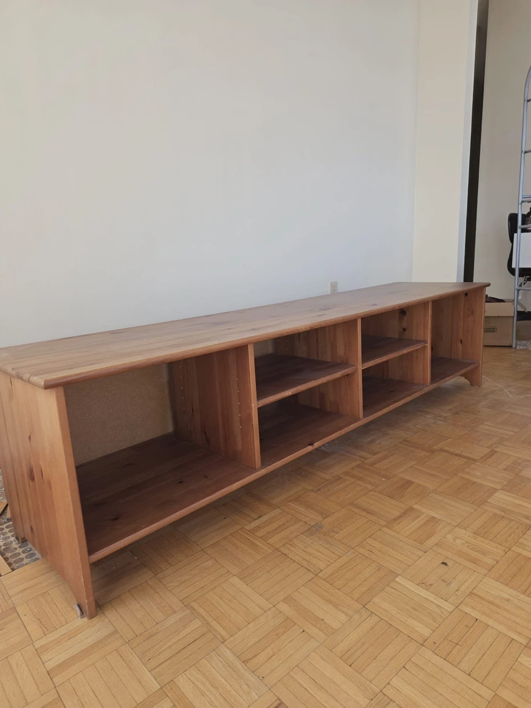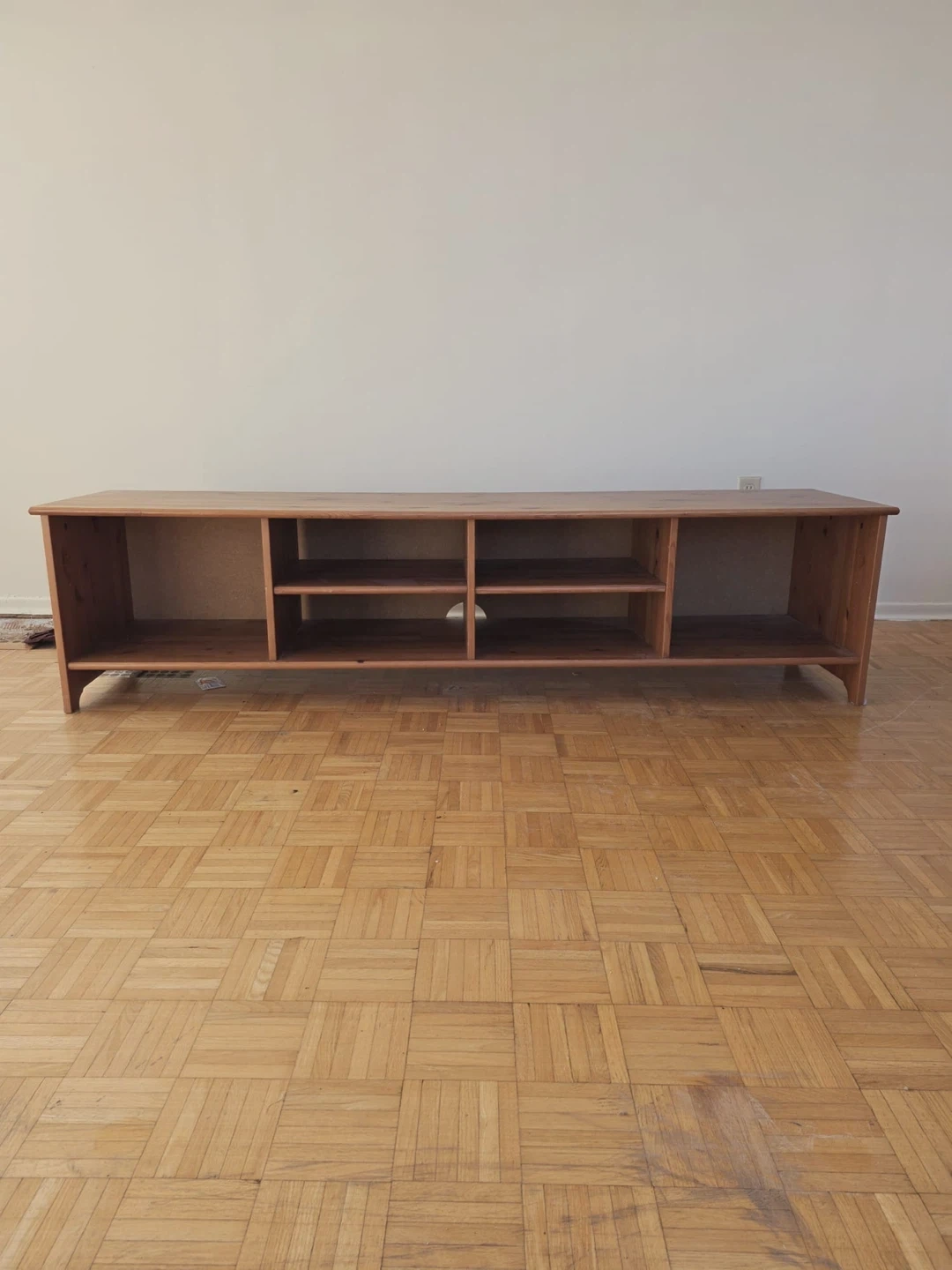 This is a long, solid wood entertainment unit with multiple shelves. It's a light, natural wood finish. It would work well for storing media consoles or books. It's a great size for a larger living room.