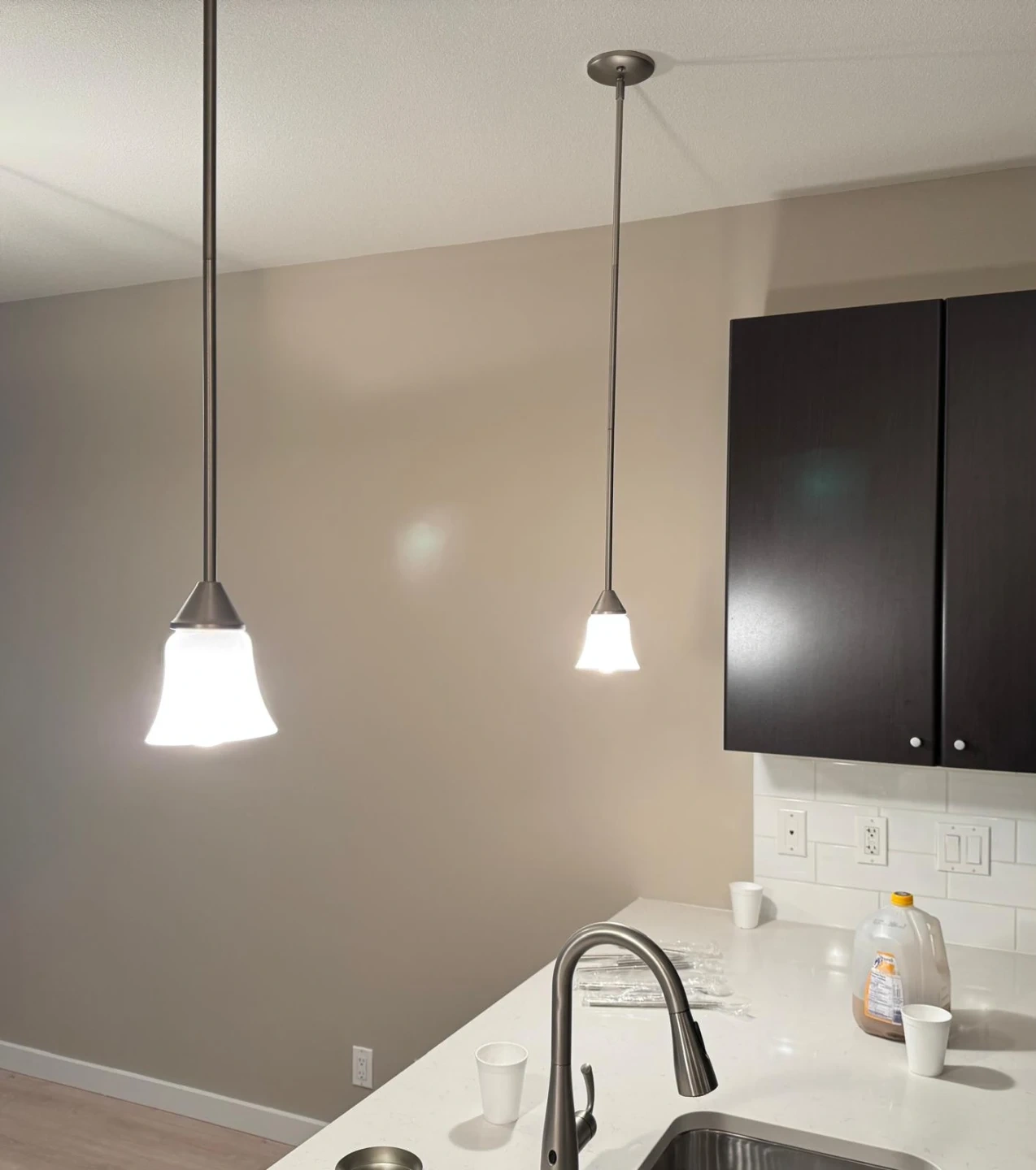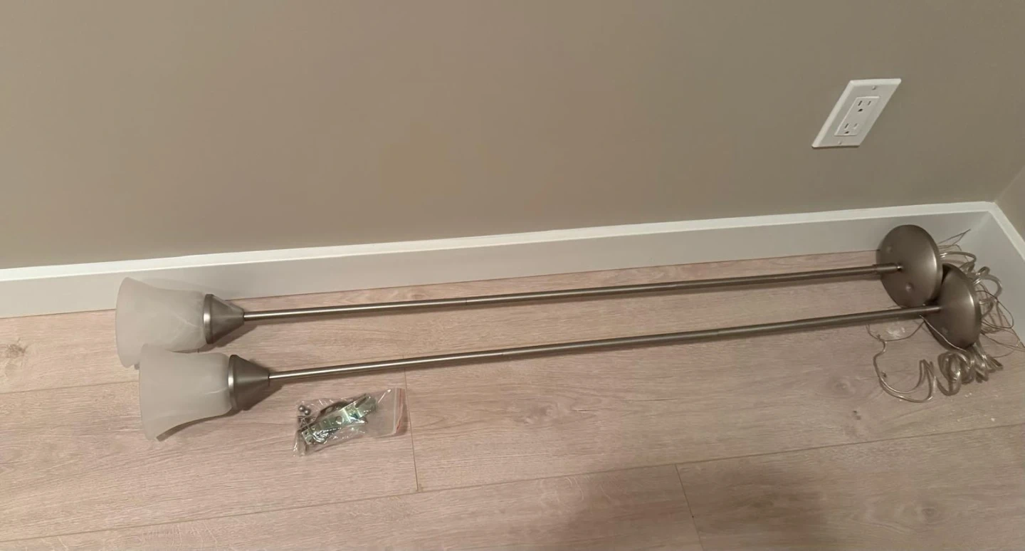 Selling a set of two brushed nickel pendant lights with frosted glass shades. Includes mounting hardware. These lights are great for adding a modern touch to your kitchen island or dining area.