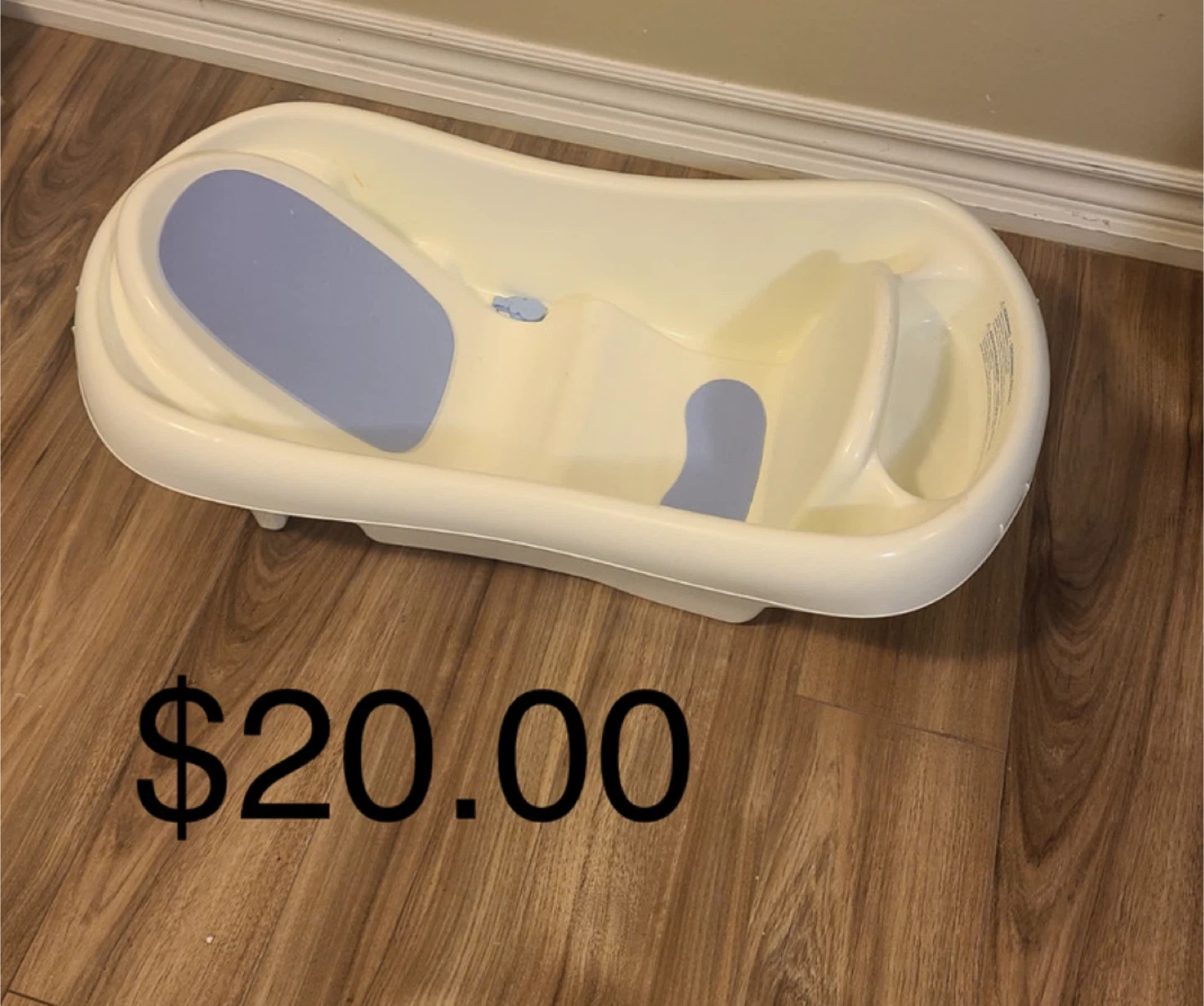 This is a baby bath tub. It has a built-in sling to support newborns. Made of plastic. It's great for bath time with your little one!