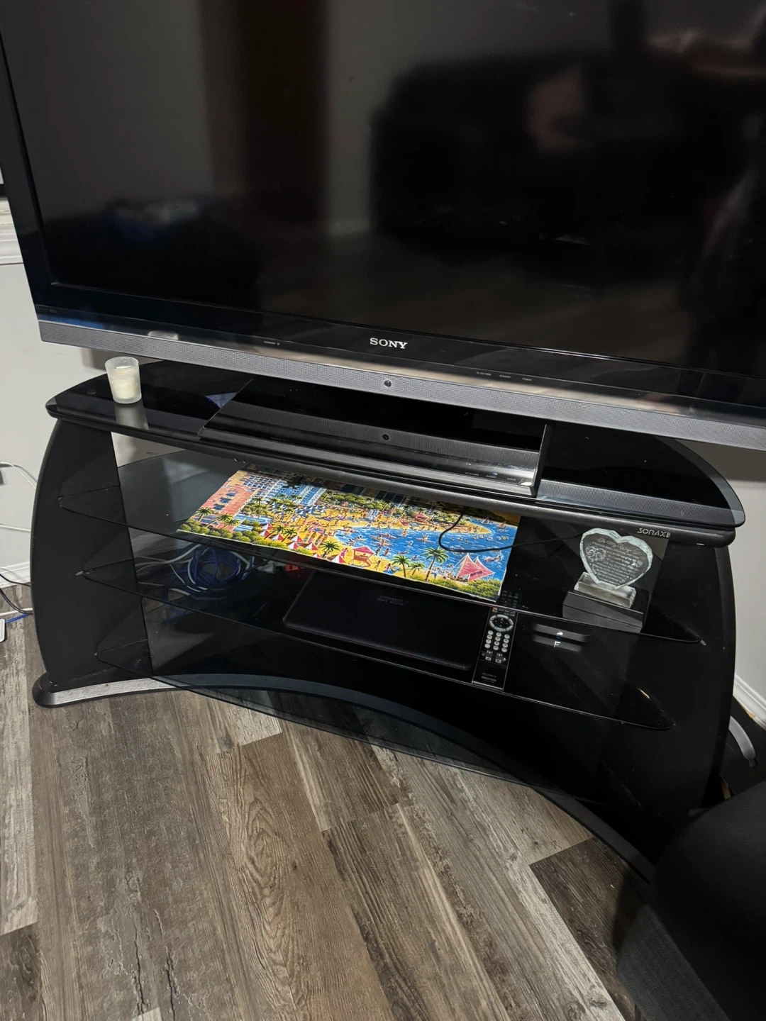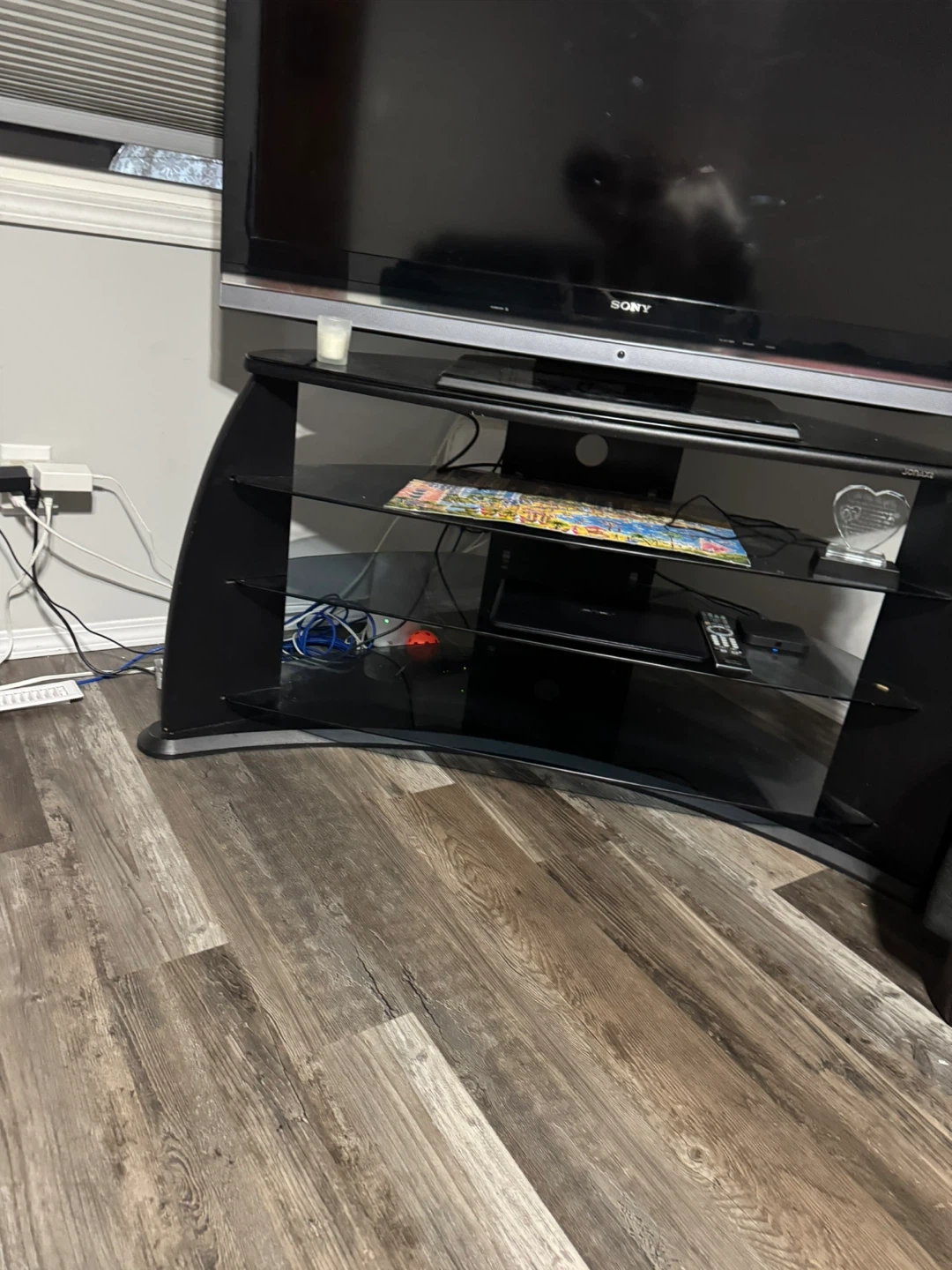 This black corner TV stand features a curved glass front and multiple shelves for storage. It's a stylish addition to any living room. The stand offers ample space for your media devices.