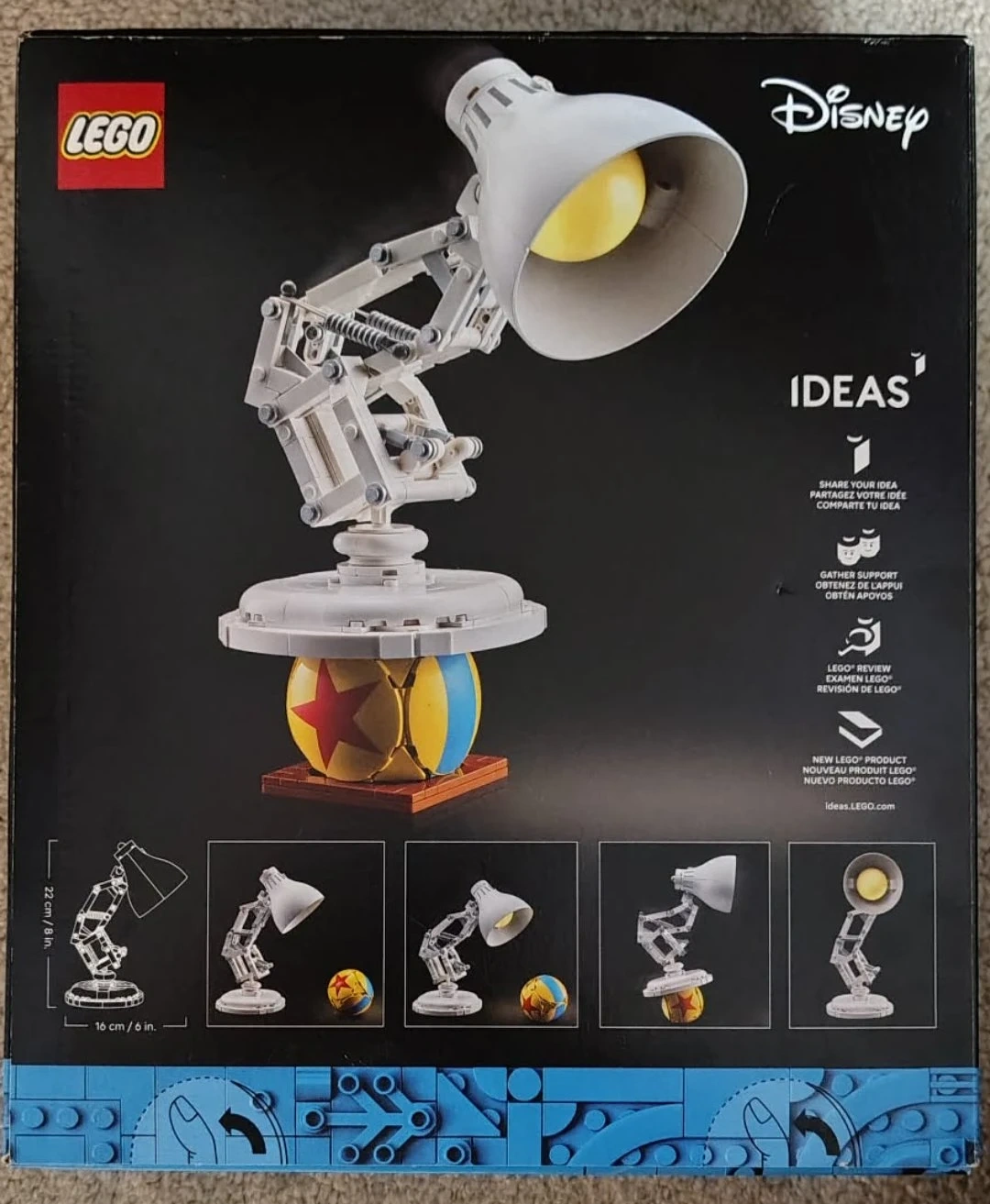 Brand new unopened Build the iconic Luxo Jr. lamp from Disney Pixar! This LEGO Ideas set includes the classic desk lamp and the famous Luxo Ball. It's a great display piece for any fan of animation. Lamp dimensions are 22 cm (8 in.) tall and 16 cm (6 in.) wide.
