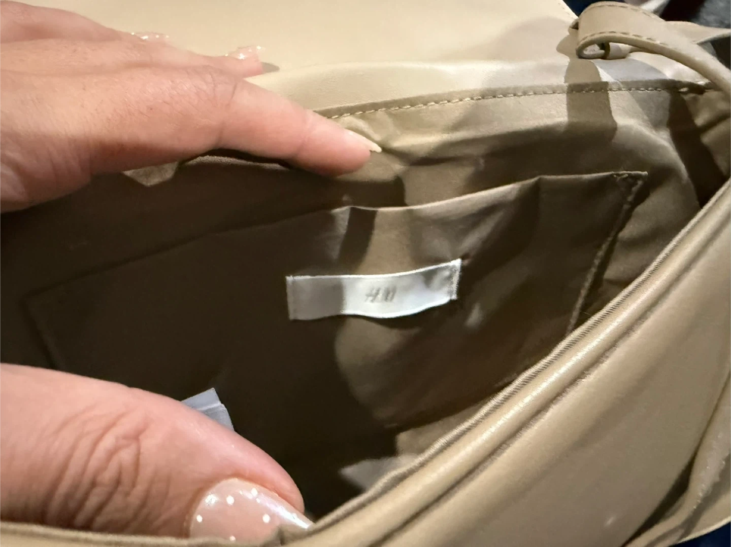 This is a beige quilted crossbody bag from H&M. It features a flap closure and a simple strap. The interior has a small pocket. Never used.